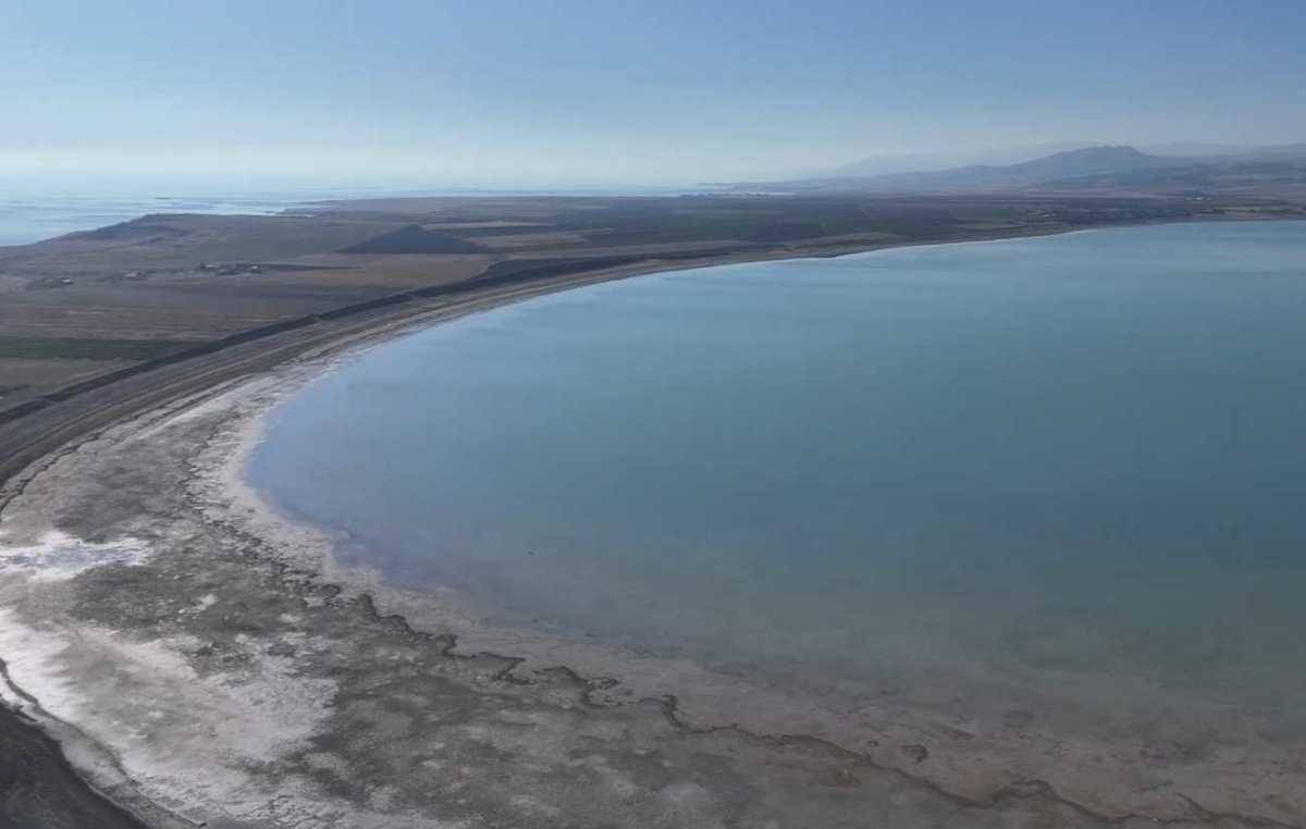 Havadan kaydedilen görüntülerde, bin 649 metre rakımda olan ve 3 bin 712 metrekarelik alana sahip Van Gölü’nün kuzey kıyısında yer alan Adilcevaz sınırlarındaki Arin Gölü ile her iki göle de kıyısı bulunan Esenkıyı köyü aynı kadrajda yer aldı.