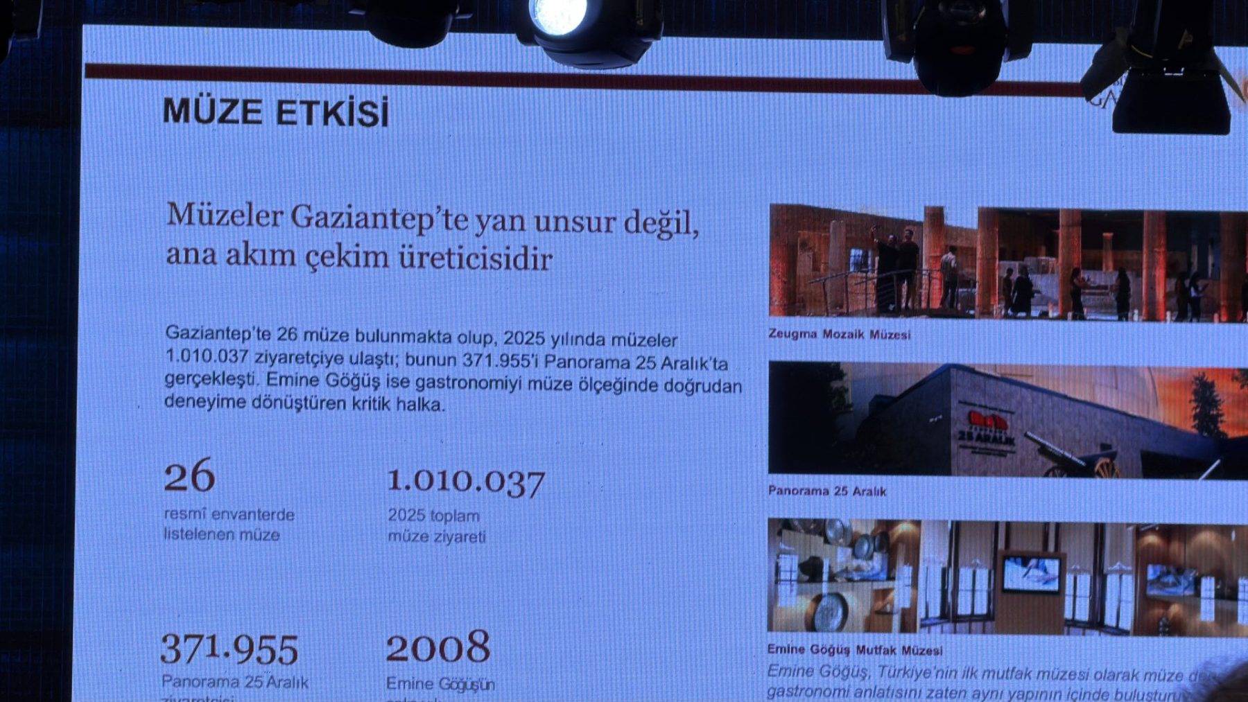 Gaziantep’te müzelerin yan unsur değil, doğrudan çekim unsuru haline geldiğini belirten Şahin, “26 müzemiz var. Yeni 5 müze ile yeni bir alan açıyoruz. Müze ve gastronomi Gaziantep’in en güçlü turizm çarpanı. Bu iki alan tek ürün olarak kurgulanmalı” dedi.