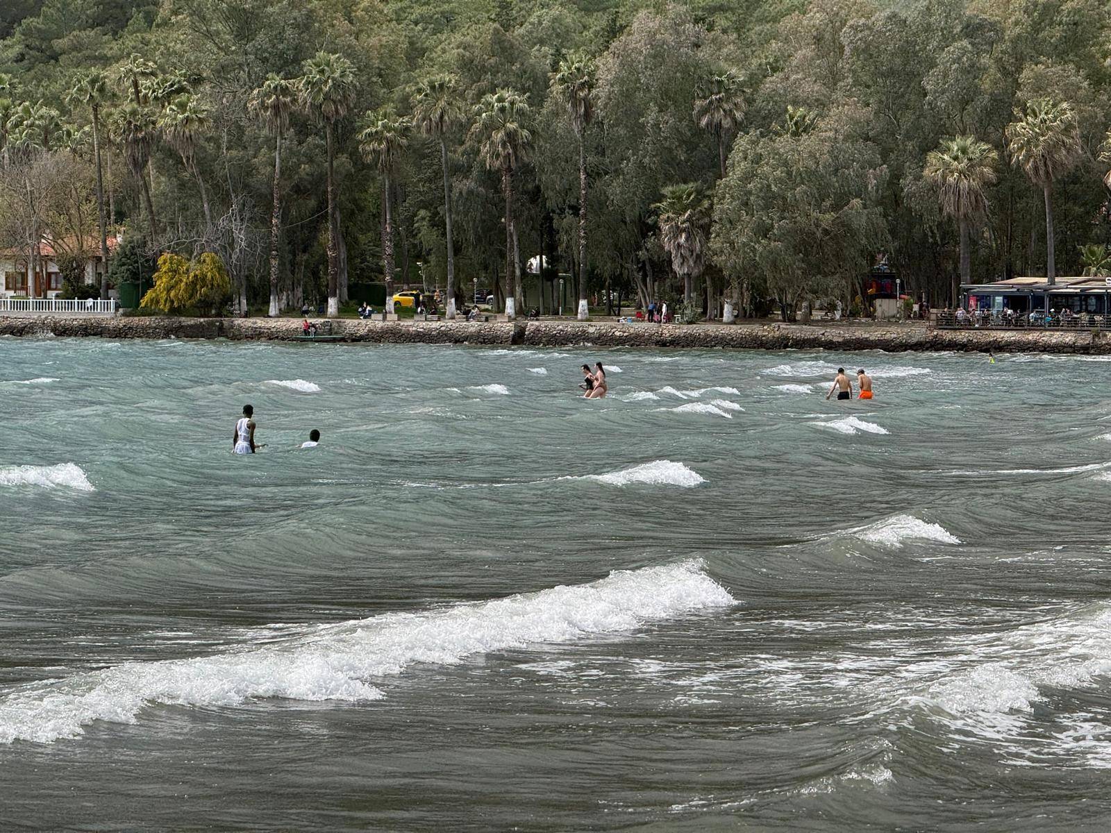 Muğla’nın ‘Sakin Kent’ unvanlı Akyaka Mahallesi’nde, hava sıcaklığının 16 derece olmasına aldırış etmeyen vatandaşlar denize girdi. Sahilde yaşanan yoğunluk ve Azmak nehrindeki tekne turları, turizm sezonunun bu yıl erken başladığının sinyallerini verdi.