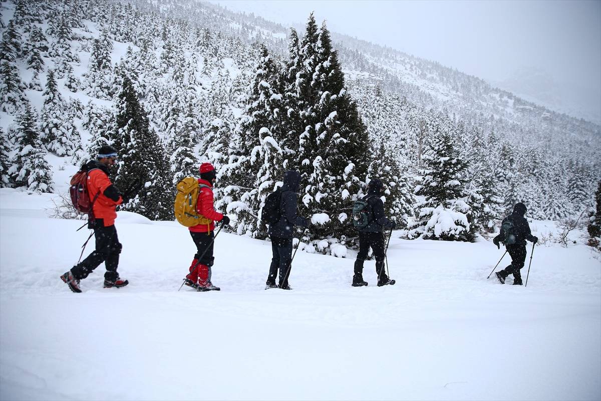 Ağaçların arasındaki karla kaplı yolları aşan dağcılık tutkunları, hem performanslarını test ediyor hem de doğayla iç içe vakit geçiriyor.