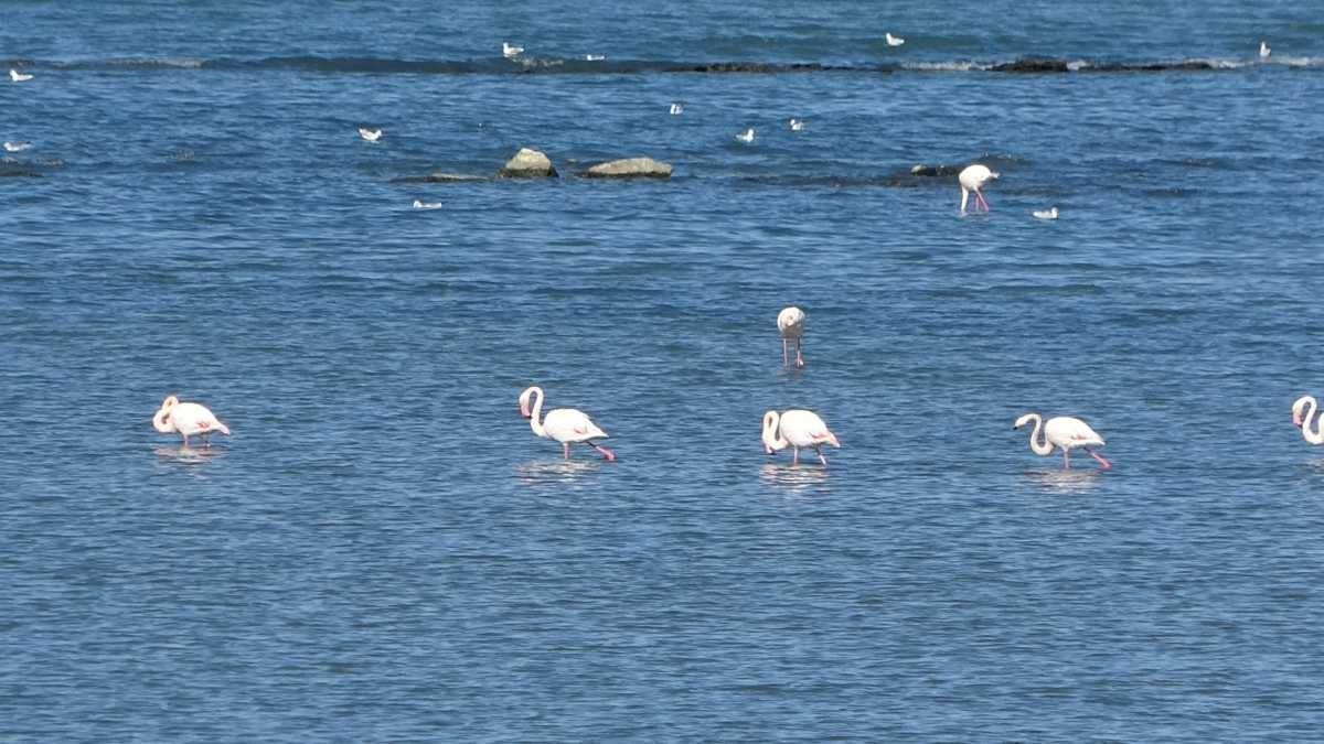 Sahil şeridine kadar inen zarif flamingolar, günün büyük bölümünü burada beslenerek ve dinlenerek geçiriyor. Pembe renkleri ve büyüleyici görünümleriyle İskele sahiline adeta görsel bir şölen taşıyan kuşlar, vatandaşların da büyük ilgisiyle karşılaştı.