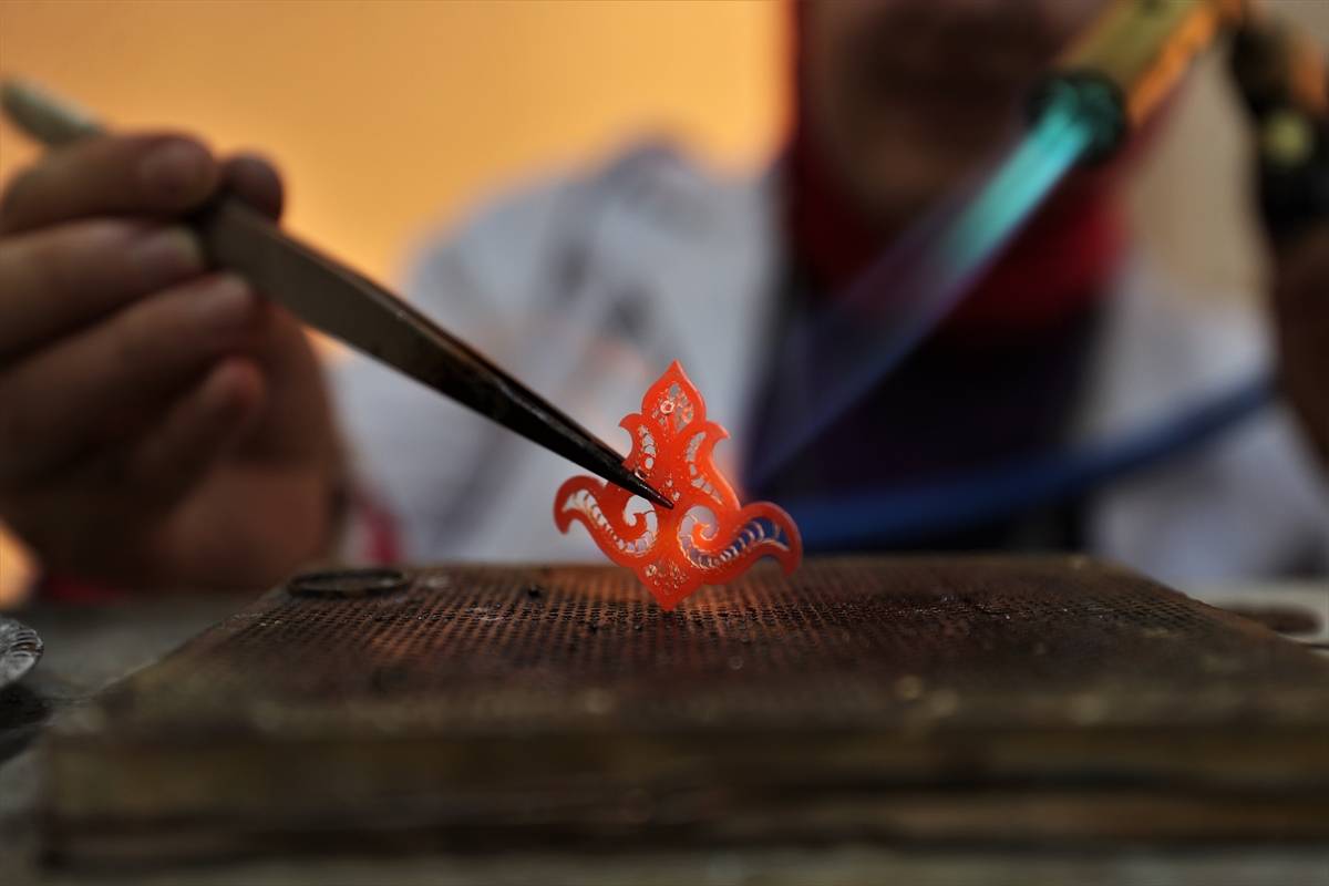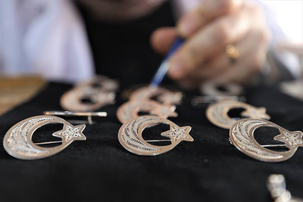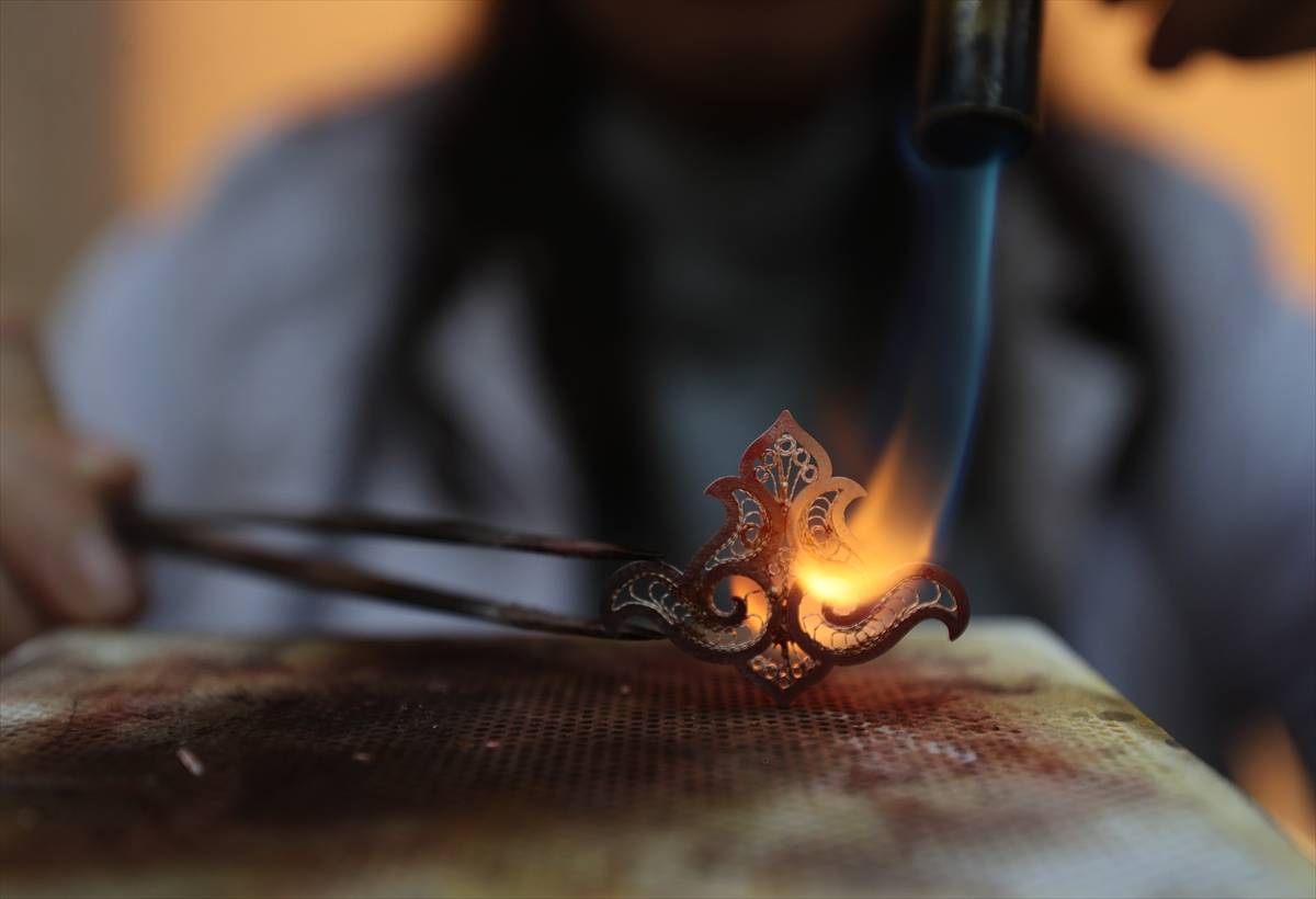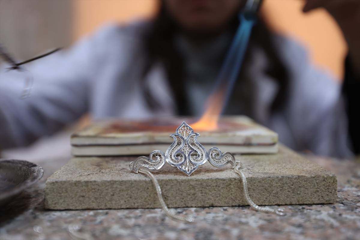 Atölyede çalışan gümüş telkari ustası İbrahim Cırık, ortaya çıkarılan tasarımları gümüş tellerle ilmek ilmek şekillendirdiklerini, küpe, kolye ve broş gibi takılara dönüştürdüklerini söyledi.