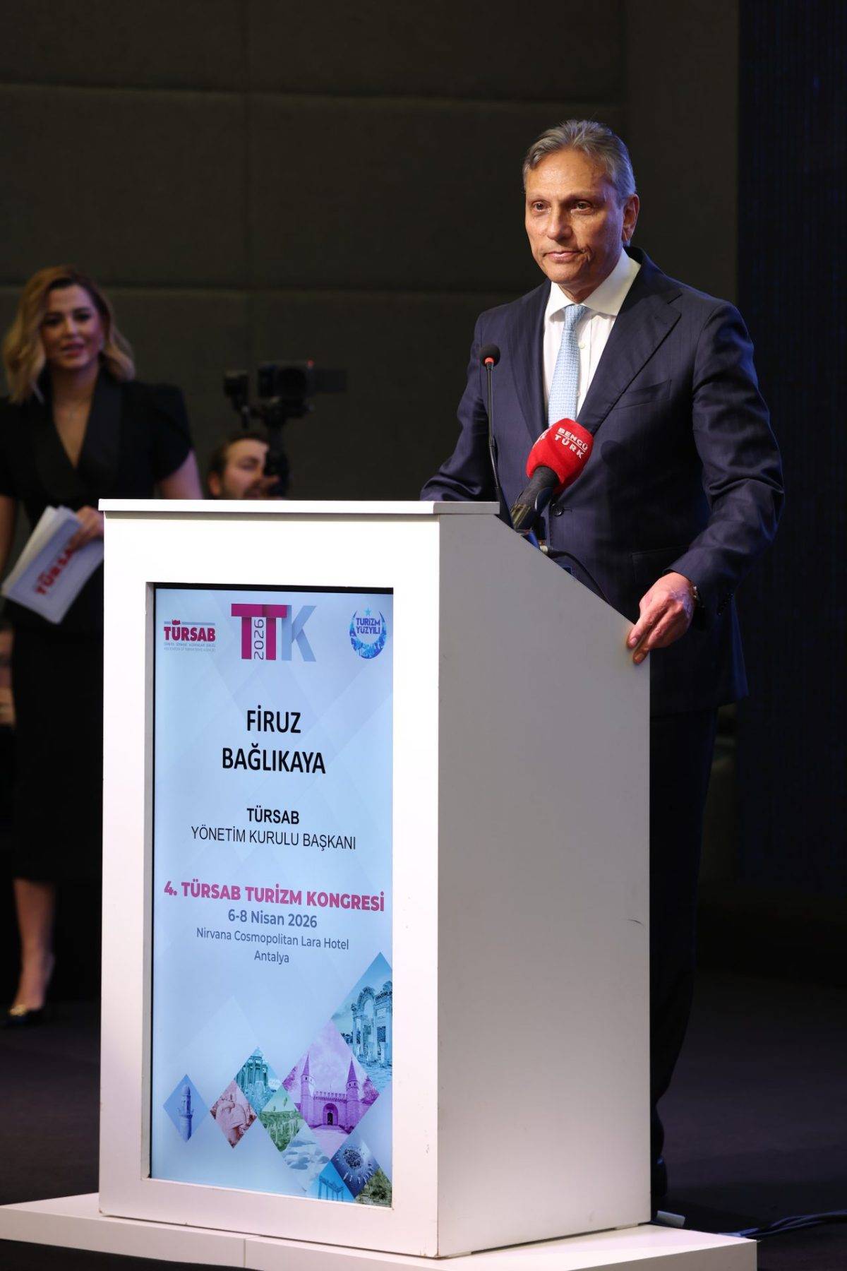4’üncü TÜRSAB Turizm Kongresi’nin açılış konuşmasını TÜRSAB Genel Başkanı Firuz Bağlıkaya gerçekleştirdi. Bağlıkaya konuşmasında, turizmin toplumsal etkileri çok derinlere ulaşan özel bir sektör olduğuna dikkat çekerek şunları ifade etti: “Birçok farklı disipline uyarlanan bir söz vardır; Hani denir ya ‘futbol asla sadece futbol değildir’ diye… Turizm de asla sadece turizm değildir. Turizm; dış ilişkilerdir, ekonomidir, iletişimdir, barıştır, umuttur, huzurdur. Bu anlam derinliğinin yanında turizm; pazarlama, ulaşım, rehberlik, konaklama ve daha birçok unsurun bilgi ve emekle, uyum içinde bir araya getirilerek ürüne dönüştürüldüğü bir faaliyettir.”