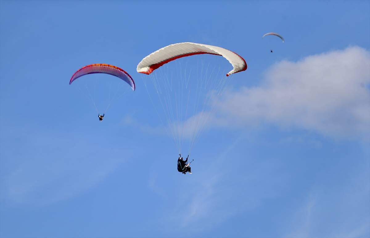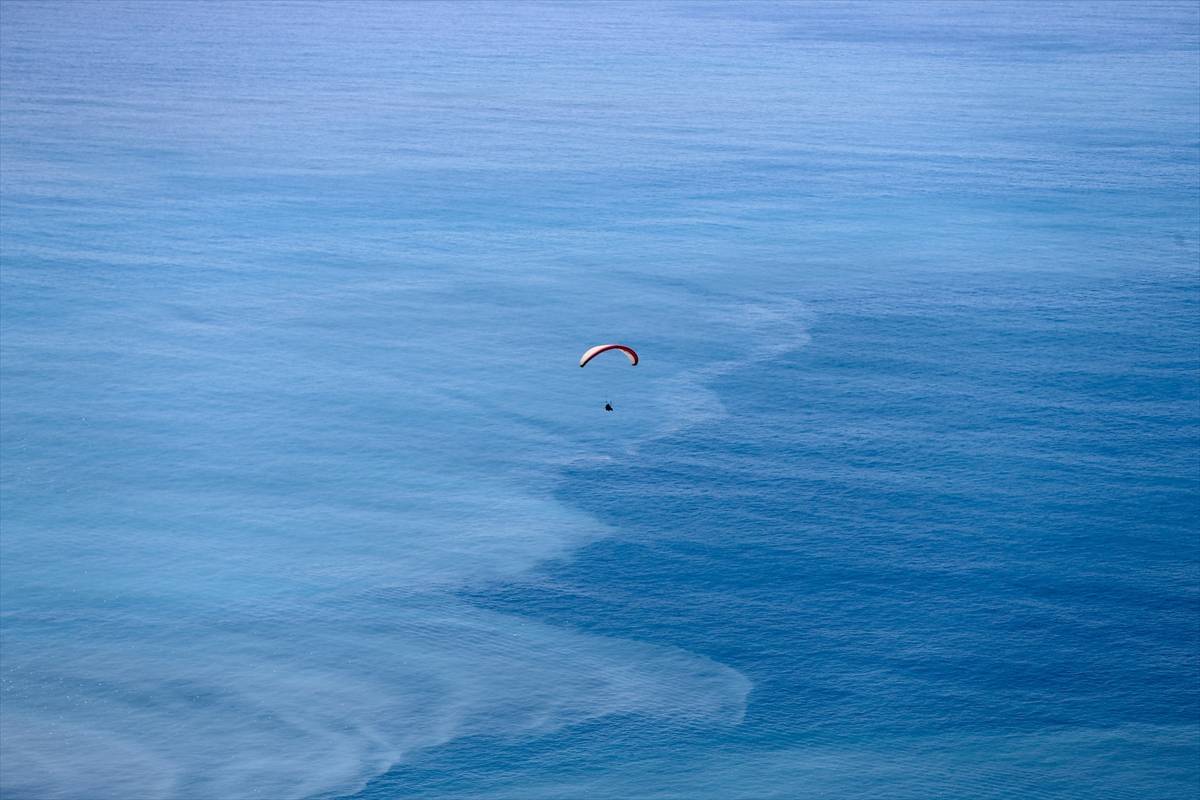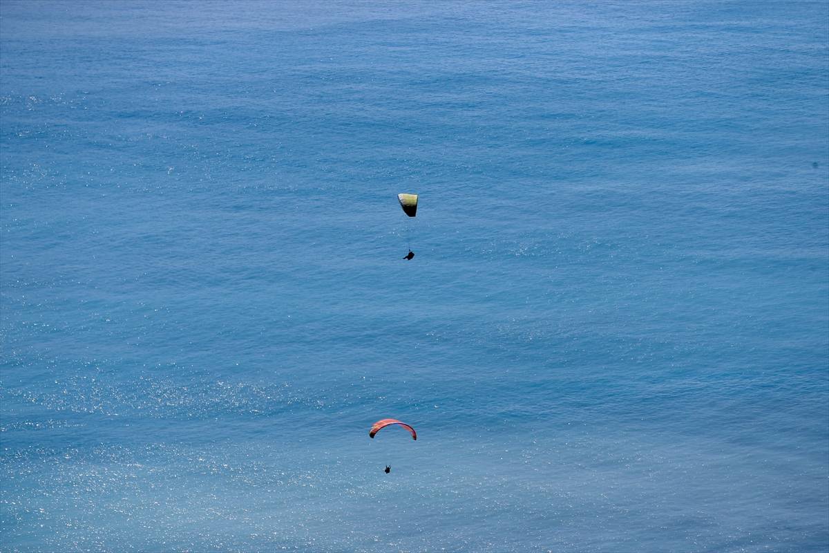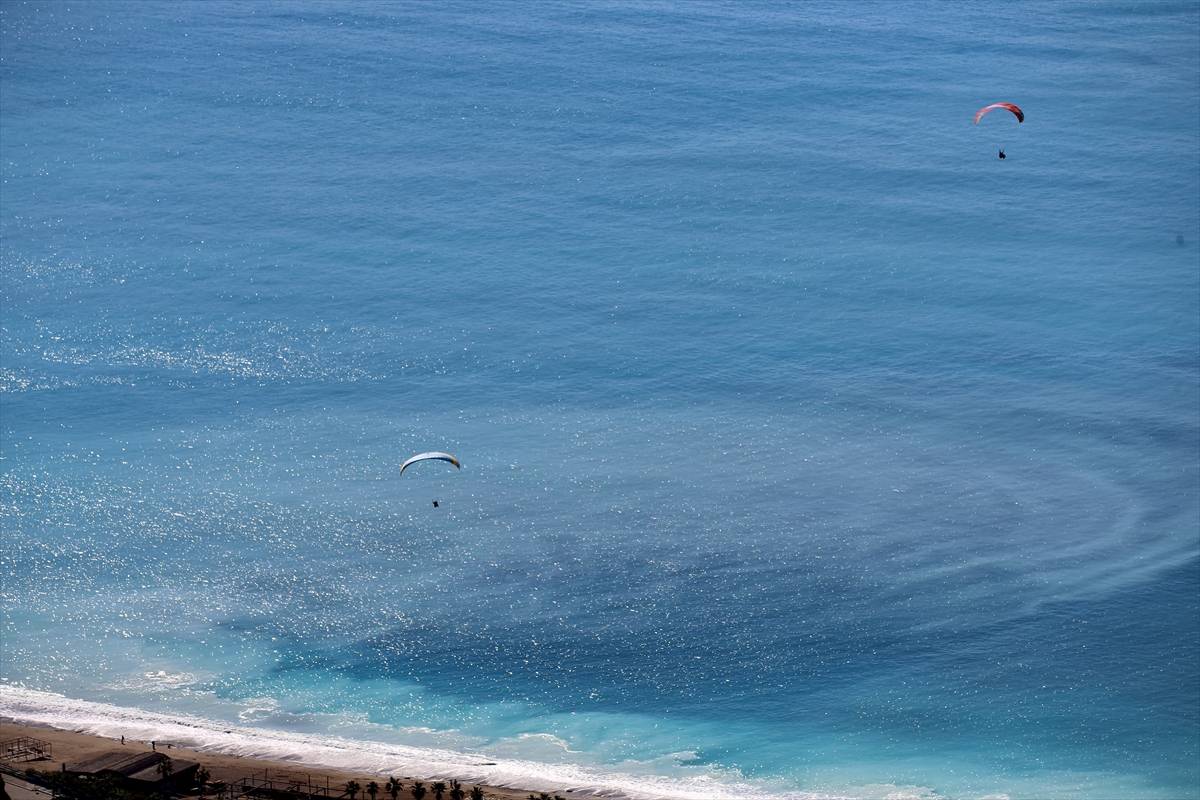 Tatilciler, pilotların yaptığı akrobasi hareketleriyle yerden yaklaşık 2 bin metre yükseklikte heyecan dolu dakikalar yaşıyor.
