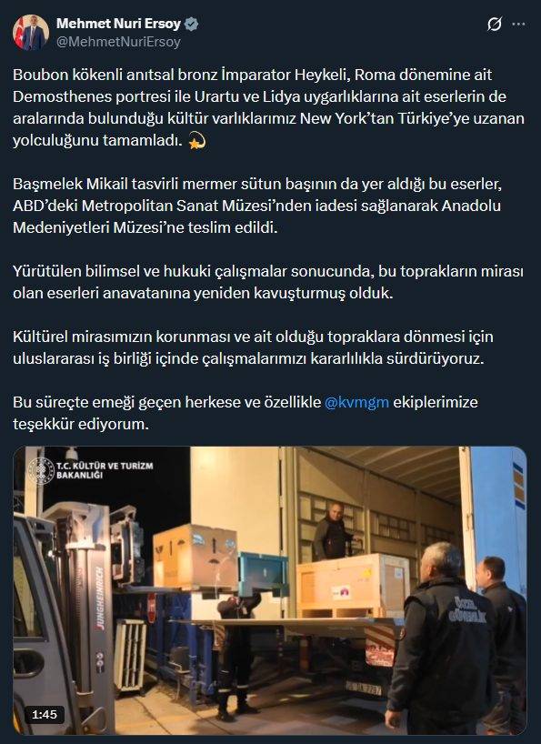 Bakan Ersoy, sosyal medya hesabından yaptığı paylaşımda, “Boubon kökenli anıtsal bronz İmparator Heykeli, Roma dönemine ait Demosthenes portresi ile Urartu ve Lidya uygarlıklarına ait eserlerin de aralarında bulunduğu kültür varlıklarımız New York’tan Türkiye’ye uzanan yolculuğunu tamamladı. Başmelek Mikail tasvirli mermer sütun başının da yer aldığı bu eserler, ABD’deki Metropolitan Sanat Müzesi’nden iadesi sağlanarak Anadolu Medeniyetleri Müzesi’ne teslim edildi. Yürütülen bilimsel ve hukuki çalışmalar sonucunda, bu toprakların mirası olan eserleri anavatanına yeniden kavuşturmuş olduk. Kültürel mirasımızın korunması ve ait olduğu topraklara dönmesi için uluslararası iş birliği içinde çalışmalarımızı kararlılıkla sürdürüyoruz.” ifadelerine yer verdi.
