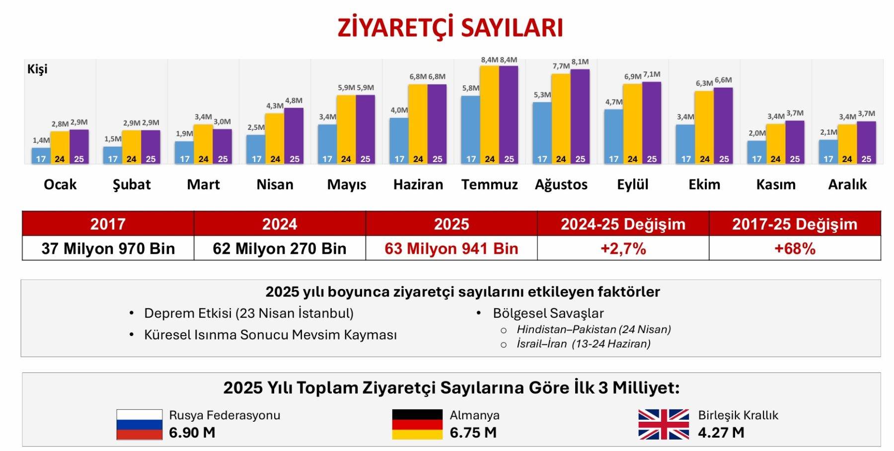 Bakan Ersoy, sözlerine şöyle devam etti: “İlk etapta 24 Nisan’da Hindistan-Pakistan savaşı. Bu hem Hindistan’dan gelen turist sayısını etkiledi hem de Hint kökenli UK (Birleşik Krallık) ziyaretçi sayısı da olumsuz etkilendi. Yani iki taraftan etkileşim olumsuz oldu, hem Hindistan’dan gelen sayıda bir azalma oldu hem de Hint kökenli UK’den. Ve son olarak da İsrail-İran 12 günlük savaşı. Burada özellikle nükleer tesislerin bombalanacak olması ve nükleer serpinti riskiyle sezon yani ekime kadarki, kasıma kadarki erken rezervasyonlarında yüzde 20’ye varan iptal aldık. Özellikle resort bölgelerimiz, kıyı kentlerimiz ve yeni gelen rezervasyonlarda da bu savaş boyunca yüzde 26’lık bir düşüş oldu. Almış olduğumuz önlemler, krize karşı bağışıklık hale getirme çalışmalarının meyvelerini aslında burada gördük. Turizm Geliştirme Ajansı’nın başlattığı yoğun kampanyalar ve tanıtım çalışmaları neticesinde hızlı bir şekilde önce bu yüzde 26’lık yeni gelen rezervasyon kayıpları karşılandı, sonrasında tekrar bu kriz öncesindeki pozisyona gelinerek o yüzde 20’lik kayıplar telafi edilerek yıl sonundaki pozitif büyüme rakamı yakalandı. Ağustos itibarıyla ve özellikle son çeyreğe baktığınız zaman ortalamanın üzerinde büyüyerek yıl sonundaki pozitif büyümeyi yakalamışız.” dedi.