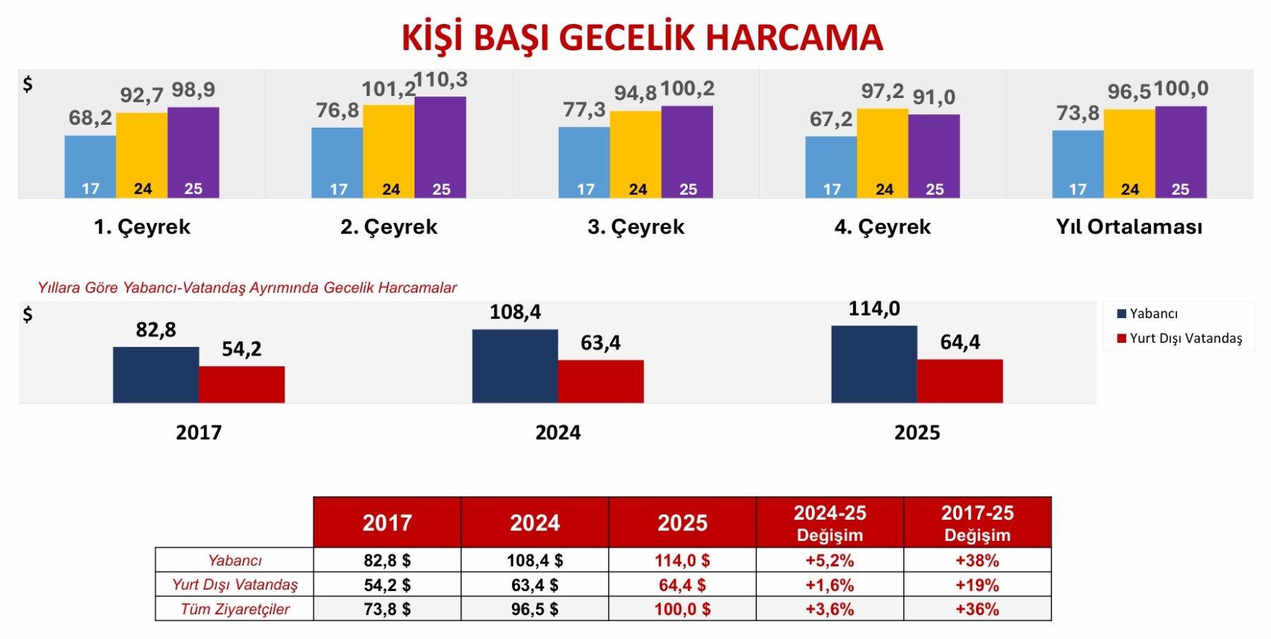 Bakan Ersoy, “En önemli konu, her zaman belirtiyorum, kişi başı gecelik gelir. Bakın kişi başı gelir değil, gecelik gelir. Bizim için burada tabii iki tane kriter var, bir yabancı ziyaretçi bir de yurt dışı yerleşik vatandaşların verileri var. Burada en önemlisi yabancı ziyaretçi, 2017 sonunda 82.8 dolarla devralmışız, geçen sene 108.4 dolara gelmiş, bu sene de 114 dolarla kapattık. Yani geçen seneyle kıyasladığımızda kişi başı gecelik gelirde yüzde 5.2’lik bir artış olmuş, 2017’ye göre kıyasladığımızda da yüzde 38’lik bir artış olmuş. Tüm ziyaretçiler ortalamasına yani hem yurt dışı yerleşik yerli vatandaşlar hem de yabancıların ortalamasını aldığımızda, 2017 sonunda 73.8 dolarken geçen sene 96.5’a ve 2025’te de 100 dolar rakamlarına gelmişiz. Burada da ortalama yüzde 3.6’lık, 2017’ye göre yüzde 36’lık bir artış olarak karşımıza çıkıyor.” dedi.
