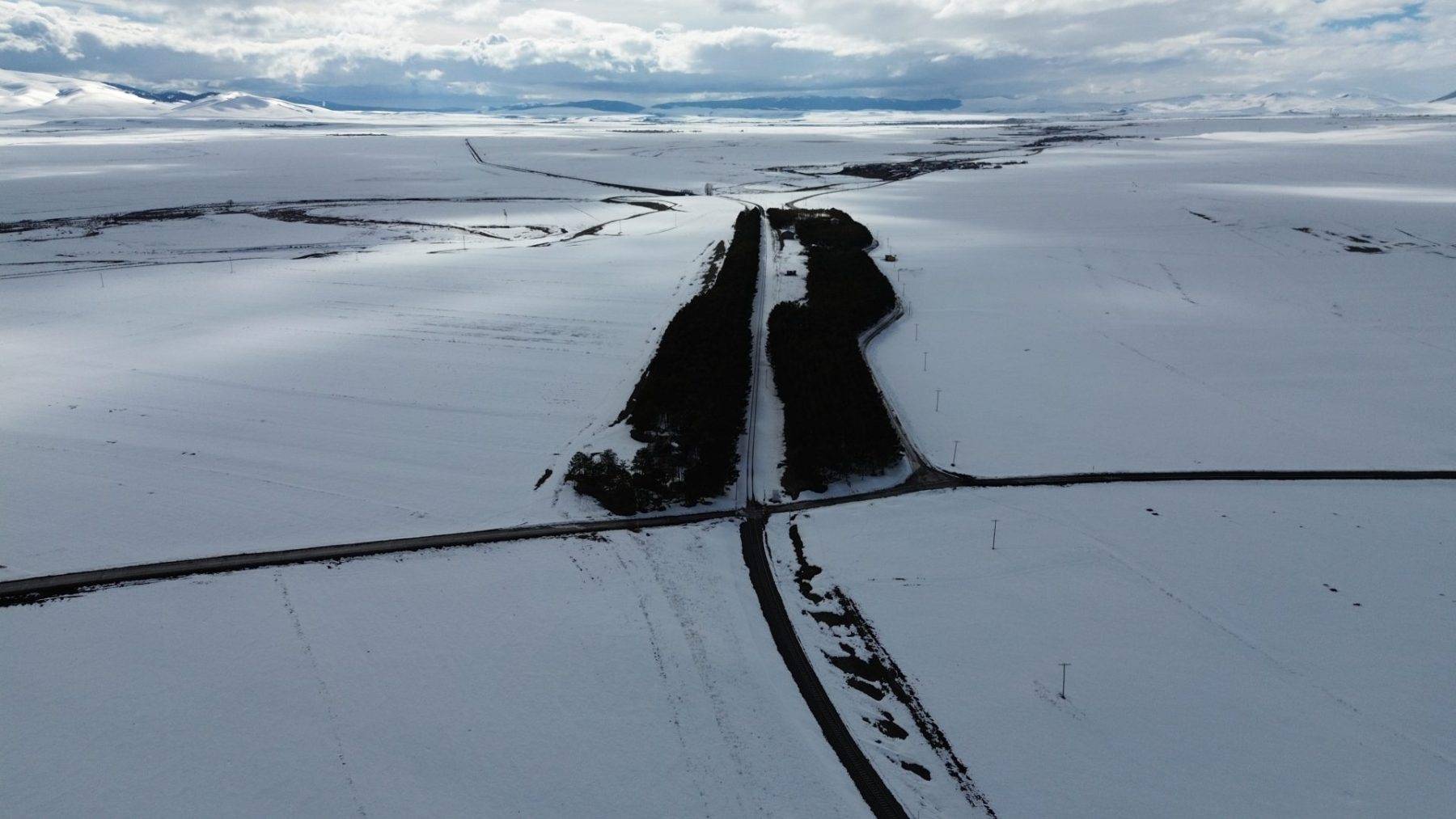 Havadan çekilen görüntülerde, karla kaplı arazilerin geometrik yapısı dikkat çekerken, doğanın sakinliği görenleri büyülüyor.