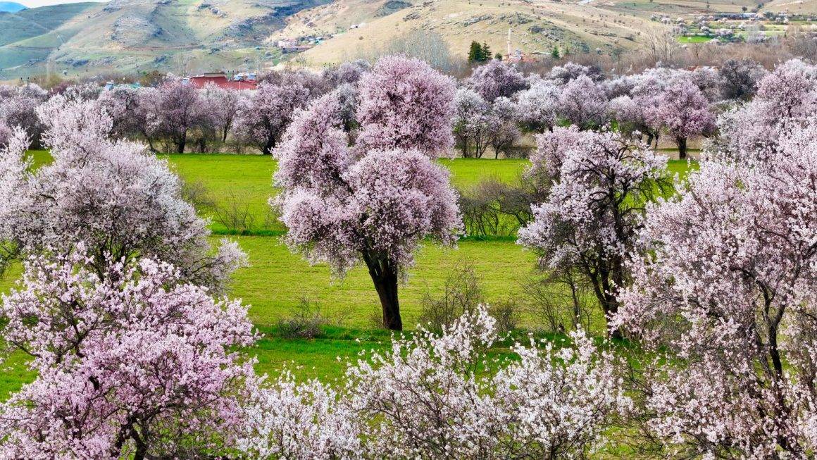 Beyaz ve pembe tonlara bürünen dallar, buğday tarlaları ve Keban Baraj Gölü’nün maviliğiyle birleşerek güzel görüntüler oluşturdu.