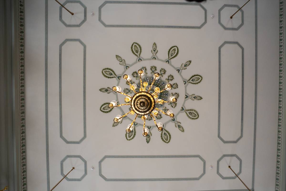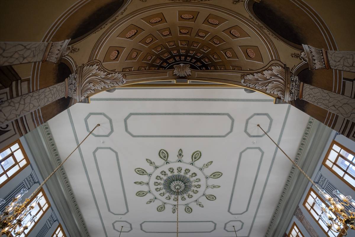 Caminin hem son cemaat yerinde hem de iç mekanında yoğun duvar resimleri bulunduğunu belirten Yelen, “Harim mekanına baktığımızda ise duvarlarda boylu boyunca uzanan kalem işi ile yapılmış batılılaşma dönemi özelliklerini gösteren sütün ve sütün başlıkları resimleri bulunmaktadır. Yapının tavanına baktığımızda ahşap bir tavan olduğu için de, doğal olarak da tam tavanın ortasında ahşap bir tavan göbeği süslemesi bulunmaktadır. Bu süsleme tamamen bitkisel süslemelerden oluşmaktadır.” diye konuştu.