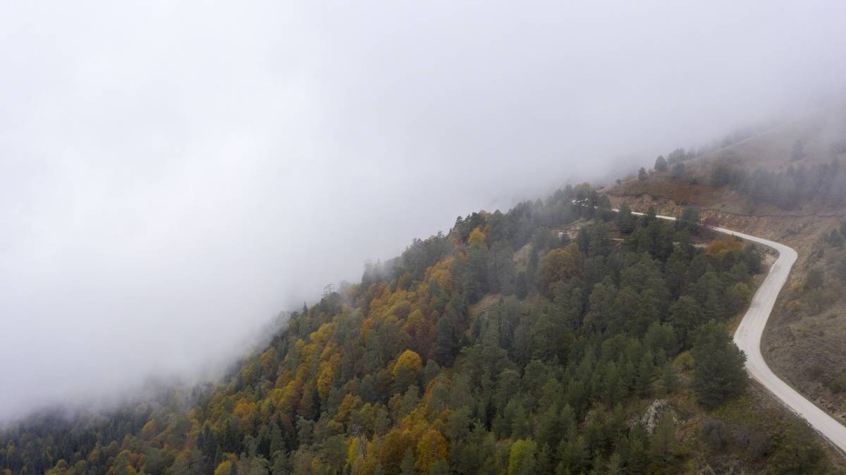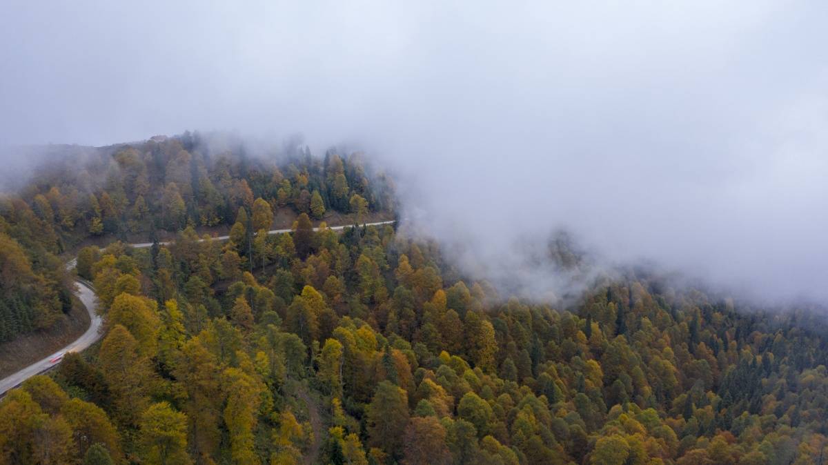 Bolu’nun doğal güzellikleriyle ünlü Yedigöller Milli Parkı yolunda etkili olan sis dronla görüntülendi.