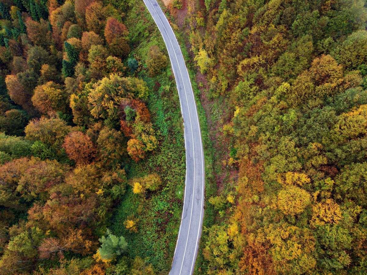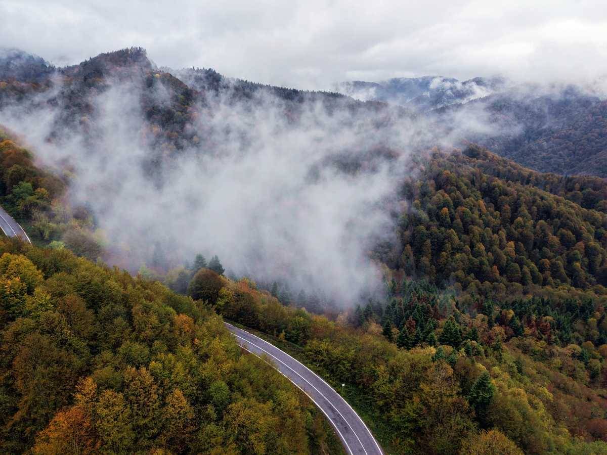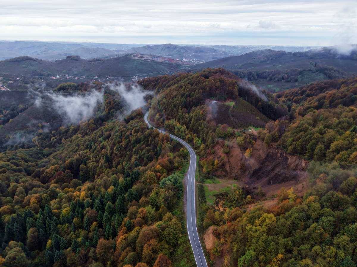 Yeşilin son direnci, sarının parlaklığı ve kızılın derinliğiyle boyanan geniş ormanlık araziler, üzerlerine inen sis tabakasıyla birleştiğinde, bölgeyi masalsı ve sinematografik bir atmosfere bürüyor.