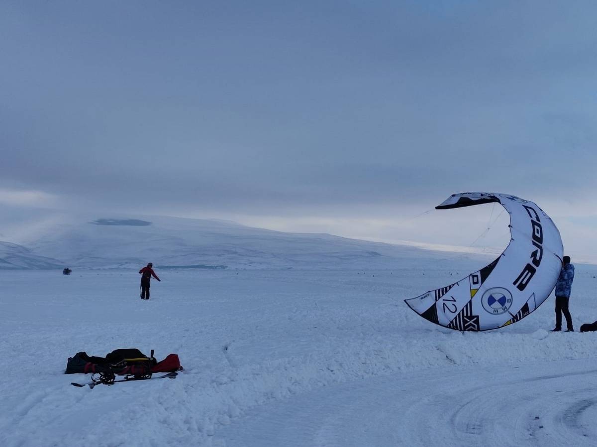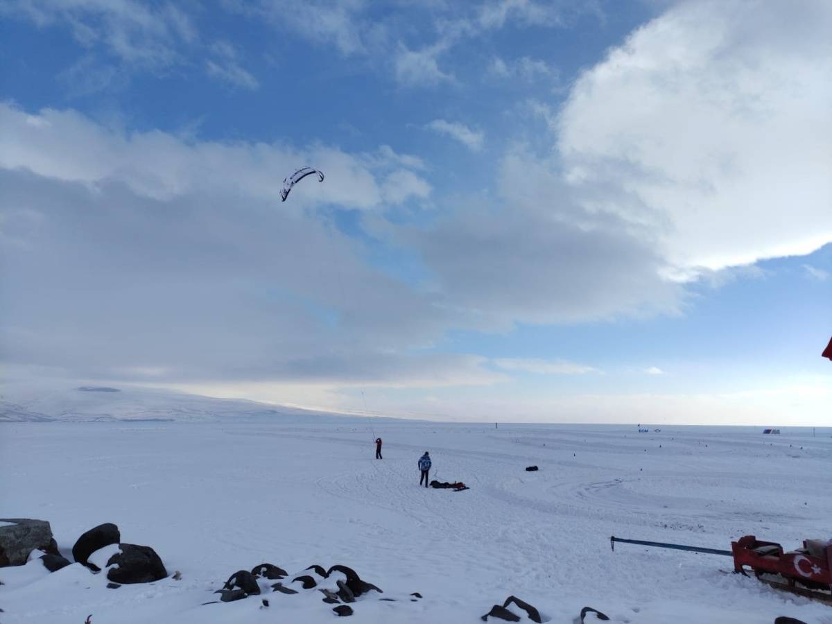 Uygun hava şartlarının oluşmasıyla birlikte gerçekleştirilen uçuşta, beyaz örtüyle kaplanan Çıldır Gölü’nün üzerinde süzülen paraşüt dikkat çekti.
