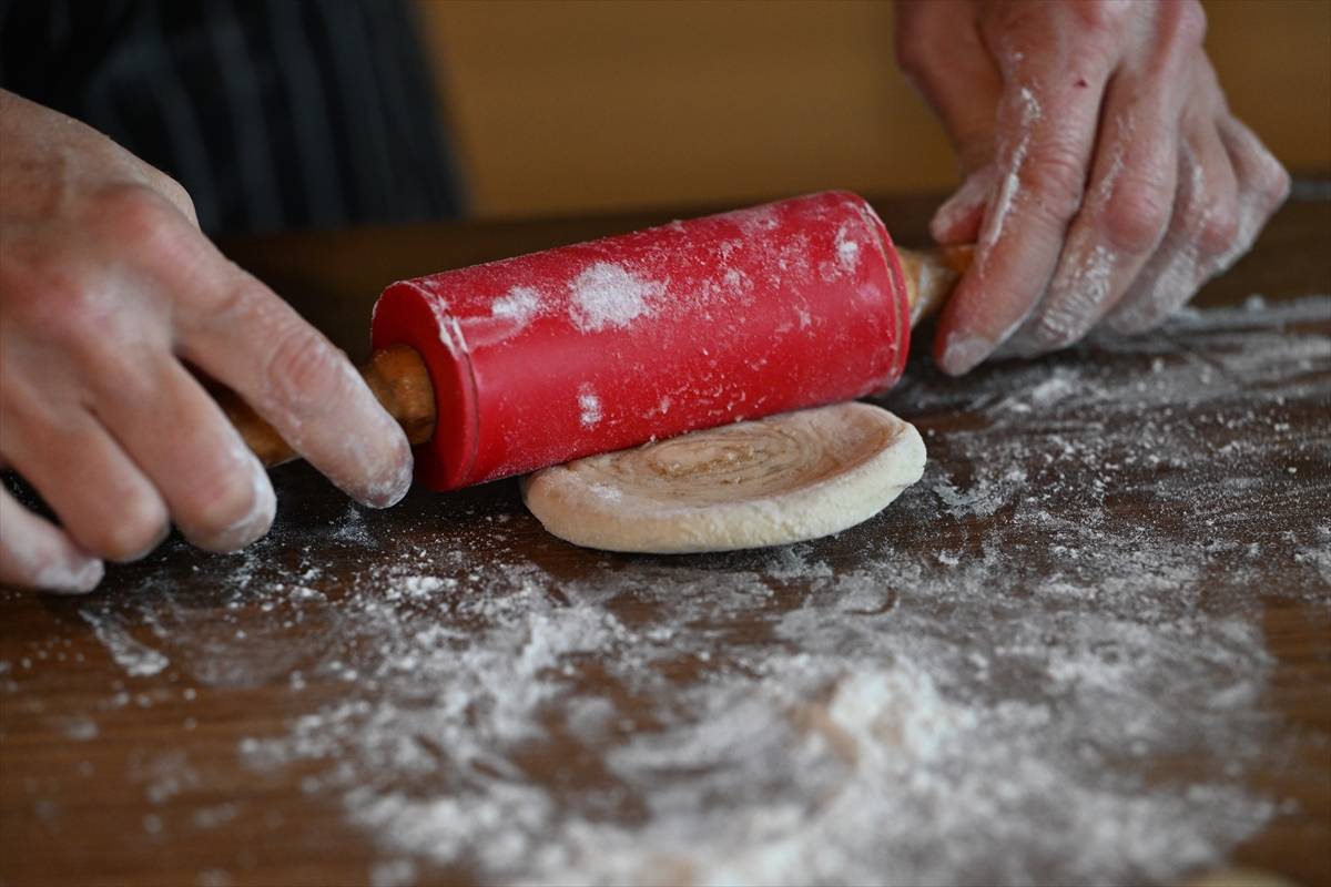 7. Rulo şeklinde kıvrılan hamur, küçük parçalara ayrılarak tekrar oklavayla açılır.