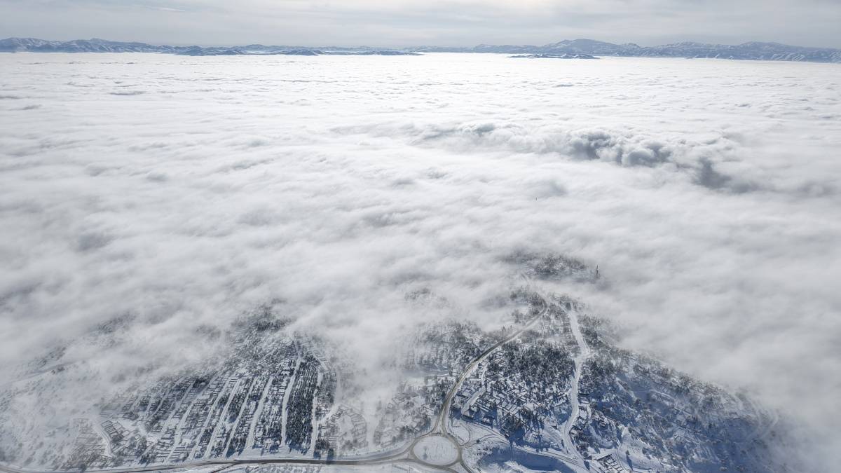 Hazar Baba Kayak Merkezi’nden Hazar Gölü yönüne doğru uzanan yüksek kesimlerde kar ve sis etkili oldu. Kayak merkezi çevresi, dağlık alanlar ve vadiler havadan görüntülendi.