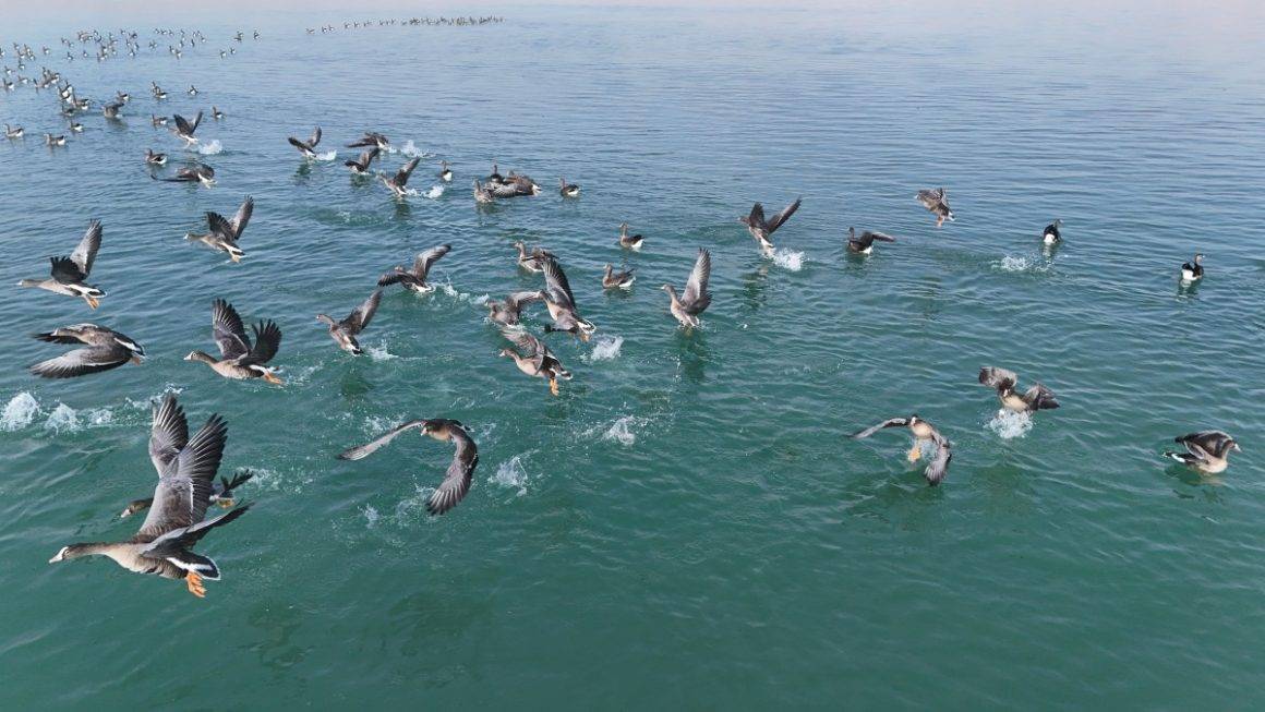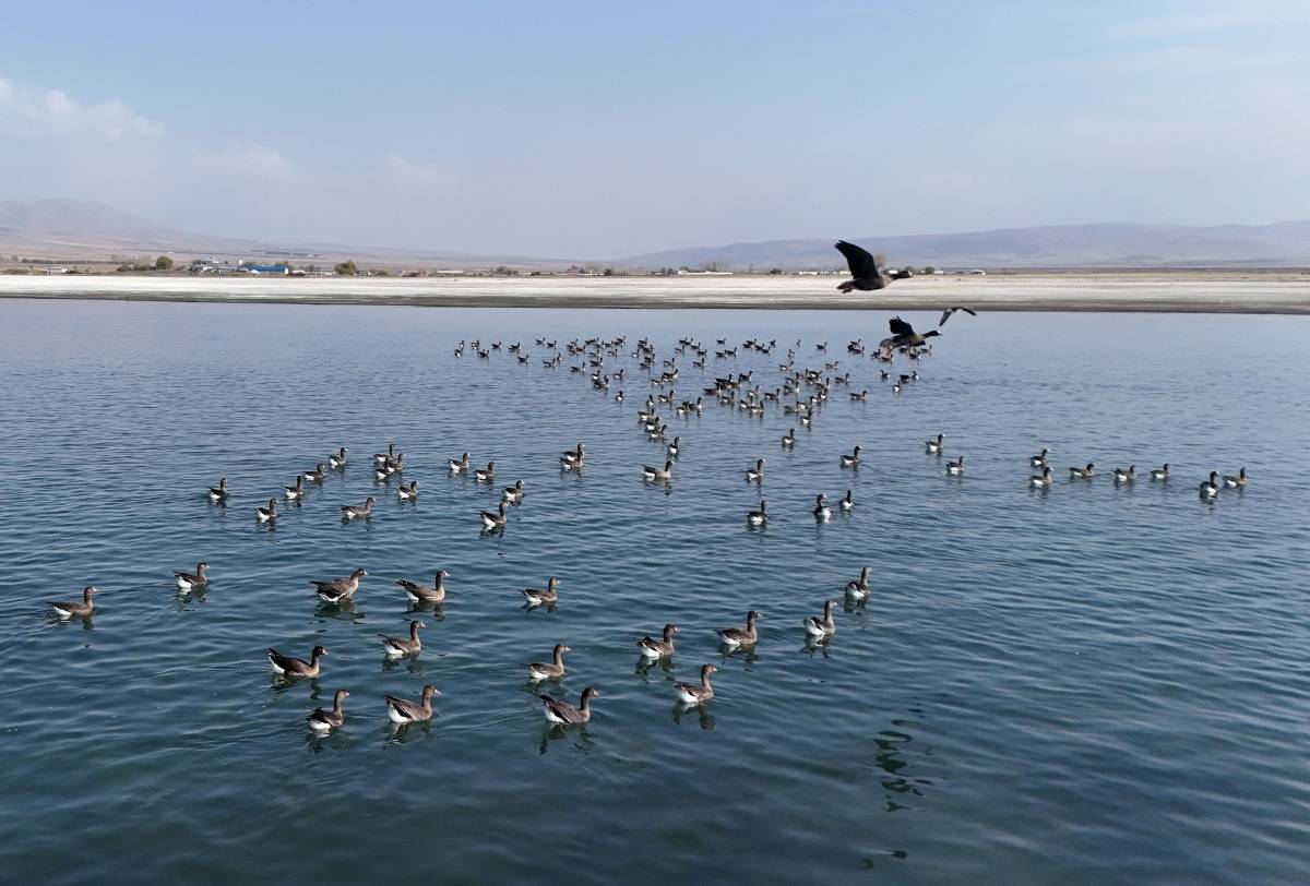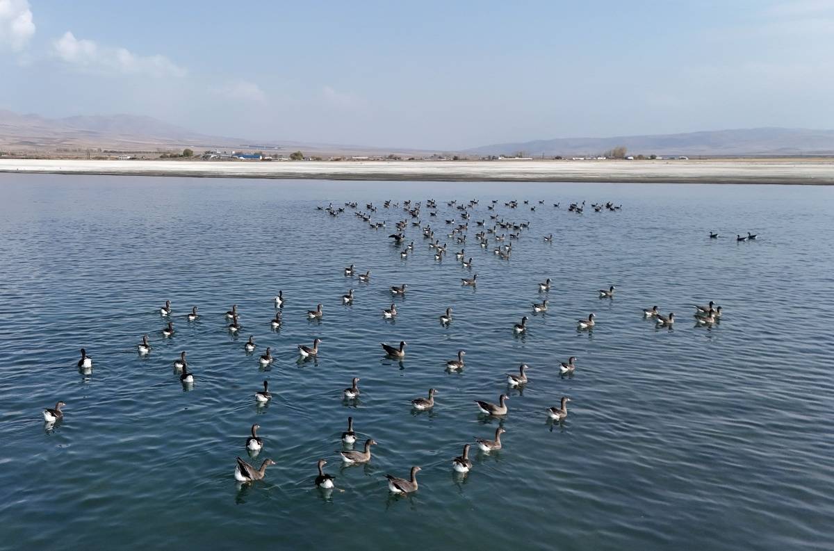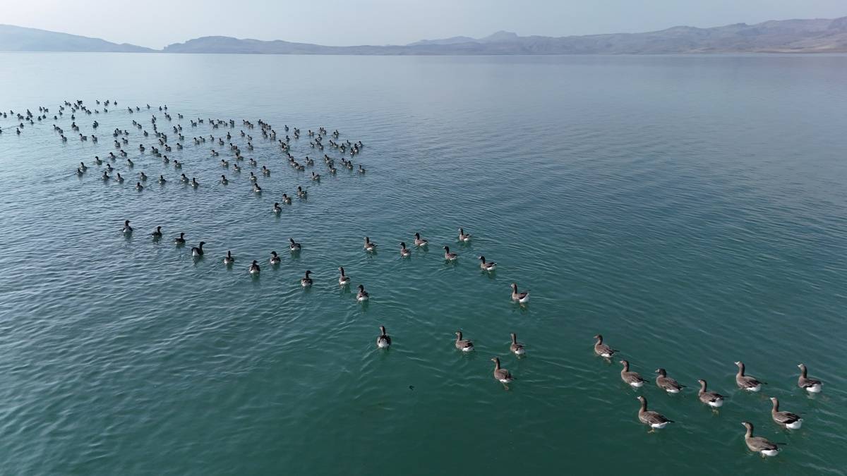 Göç yolculuklarını sürdüren küçük sakarca kazları, Van’ın doğusunda yer alan 114 kilometrekare yüzey alanı ve bin 808 rakımı ile Erçek Gölü’nde mola verdi.