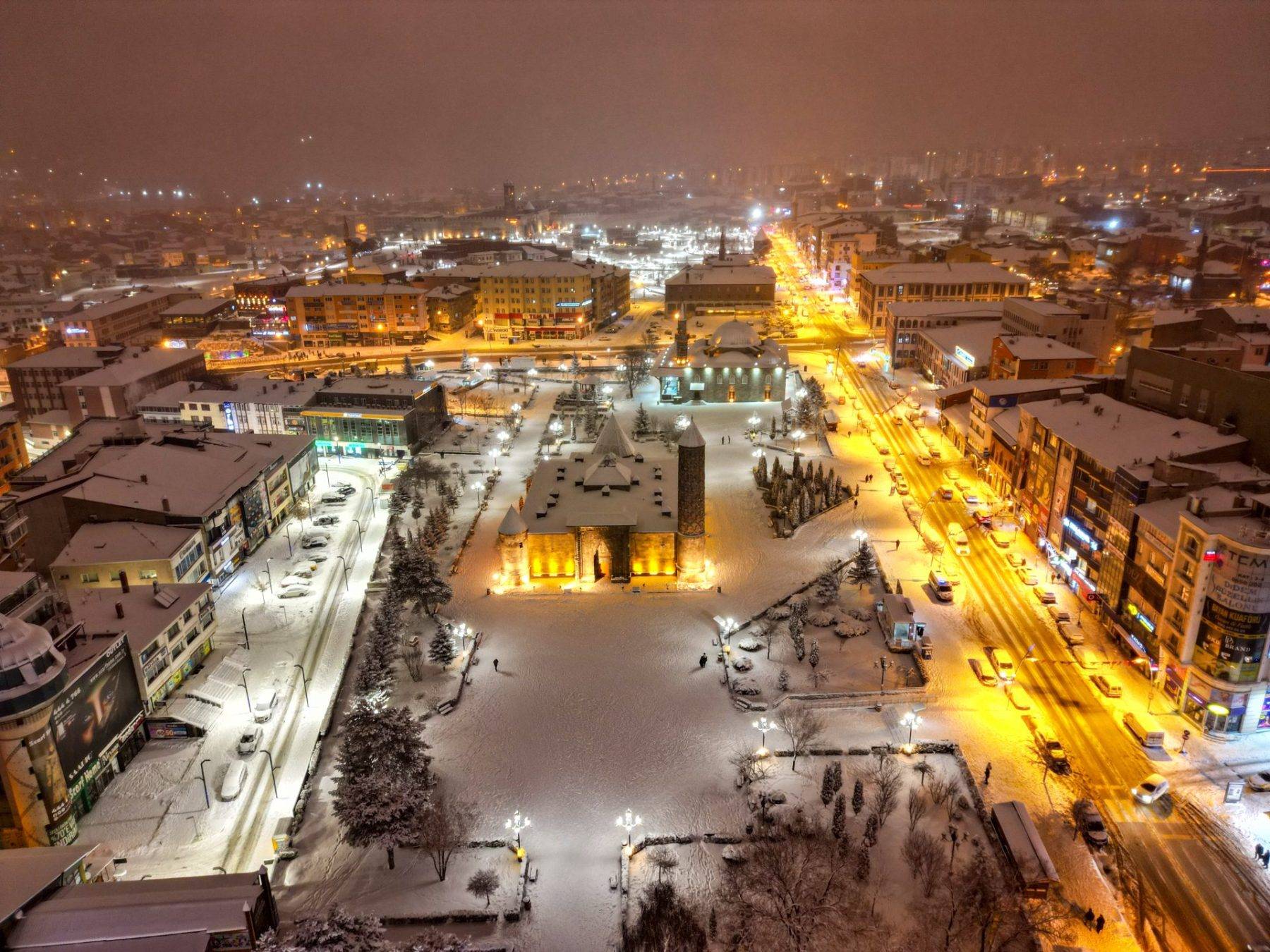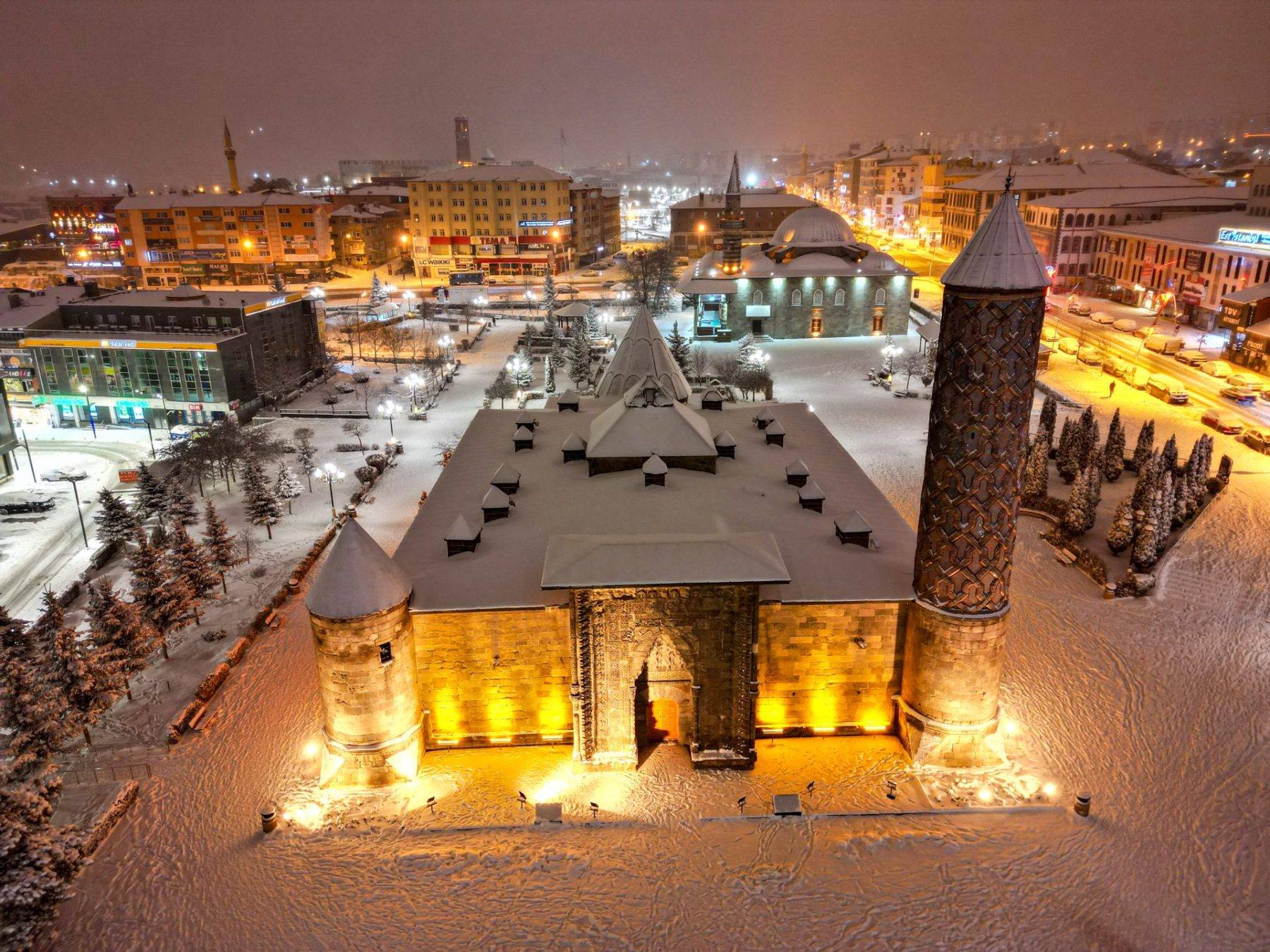 Yoğun kar yağışının ardından kentin simgeleri arasında yer alan Çifte Minareli Medrese, Erzurum Kalesi ve Yakutiye Medresesi ile çevresi beyaz örtüyle kaplandı.