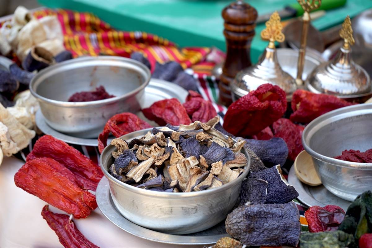 Gaziantep mutfağının vazgeçilmezlerinden kuru dolma yapımında kullanılan patlıcanlar, büyük bir özenle oyulup ipte kurutulurken “börk” olarak adlandırılan baş kısımları da küçük parçalara ayrılıp güneşte kurutuluyor.
