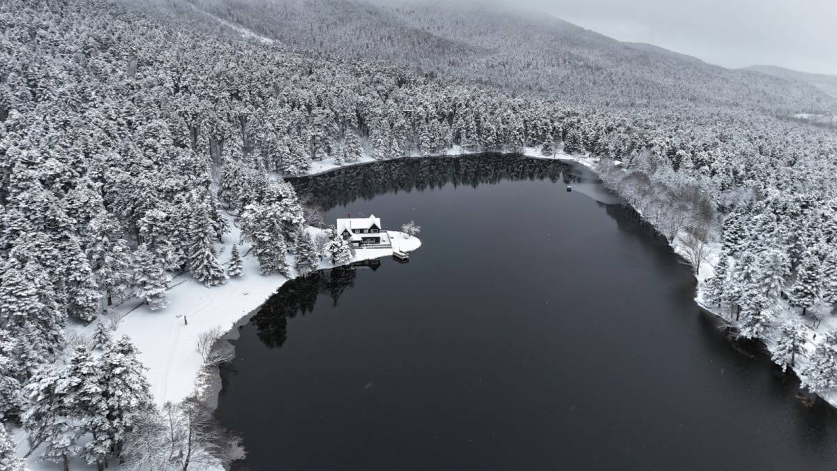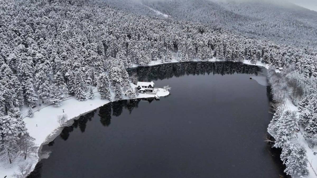 Hava sıcaklığının sıfırın altına düştüğü bölgede, gölün çevresini saran çam ormanları ve simge haline gelen Devlet Konukevi tamamen beyaza büründü.