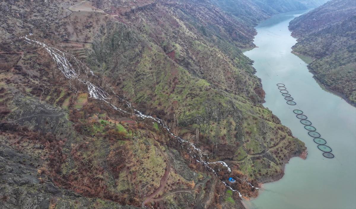 Diyarbakır’ın Çüngüş ilçesinde Maden Dağlarının sarp yamaçlarından çıkan yeni pınarlar şelaleye dönüşerek Atatürk Baraj Gölü’ne dökülüyor.