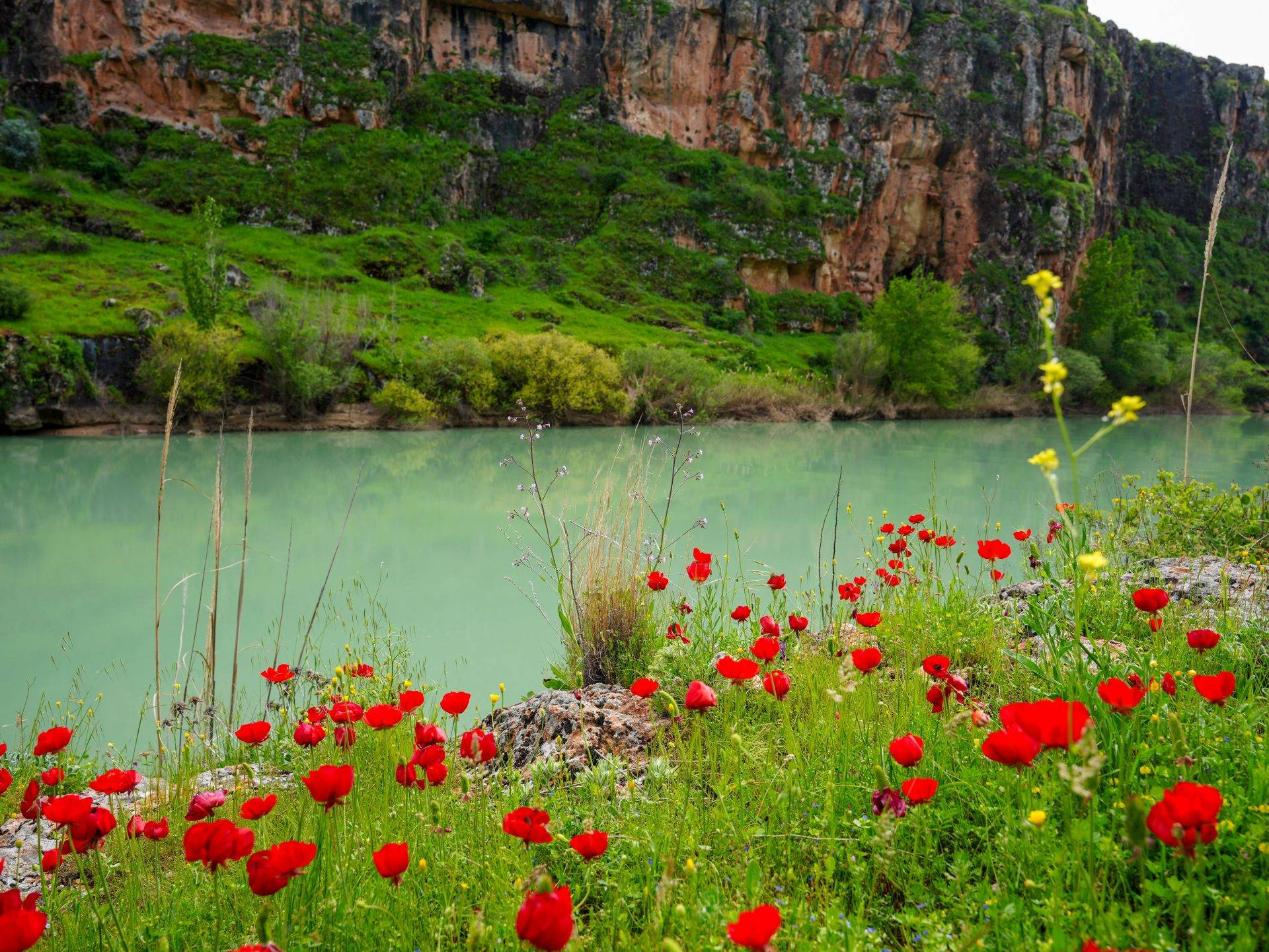 Adıyaman’ın Besni ilçesindeki 5 bin yıllık geçmişe sahip Kızılin Kanyonu, ilkbaharın gelişiyle doğanın en güzel renklerine büründü.