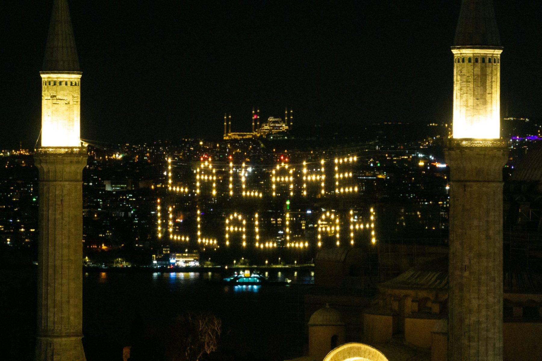 Ayasofya-i Kebir Cami-i Şerifi’nin minareleri arasına asılan mahyada ise “Lailaheillallah” yazdı.