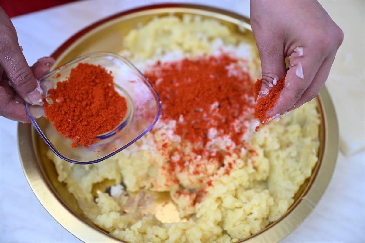 6. Hamurların ortasına patatesli harçtan alınıp yerleştirilir ve hamur parçaları birleştirilir.