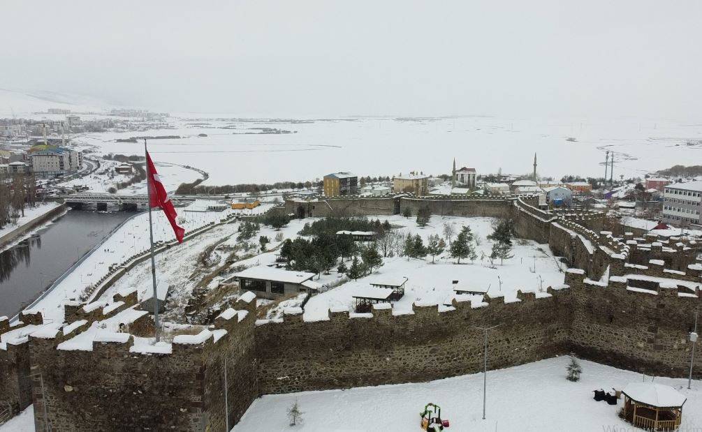 Ardahan’da son günlerde etkisini gösteren kar yağışı sonrası, kentin tarihi mekanları beyaz örtü ile kaplandı. Kür Nehri’nin Ardahan yüksek ovasındaki havzasını görecek bir konuma Kanuni Sultan Süleyman tarafından yaptırılan karlar altındaki Ardahan Kalesi, havadan görüntülendi.