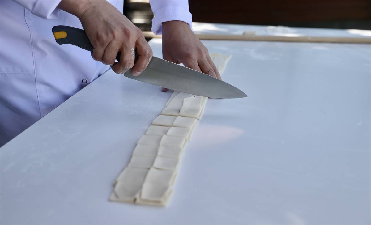 5.Hamur açıldıktan sonra bıçakla kare şeklinde kesilir.