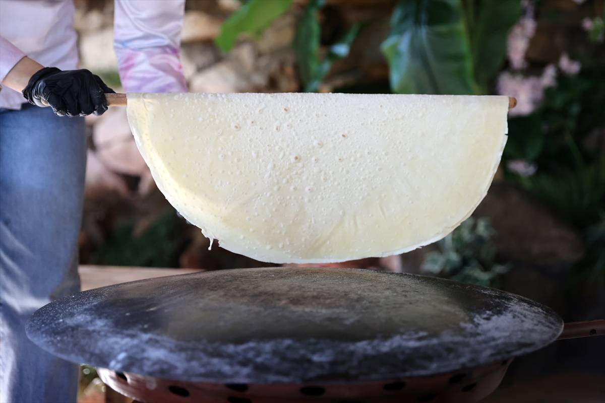 4. Dinlenen hamur 14 eşit bezeye ayırılır, her bezeye nişasta dökülerek çok ince açılır ve kızan sacın üzerinde pişirilir.