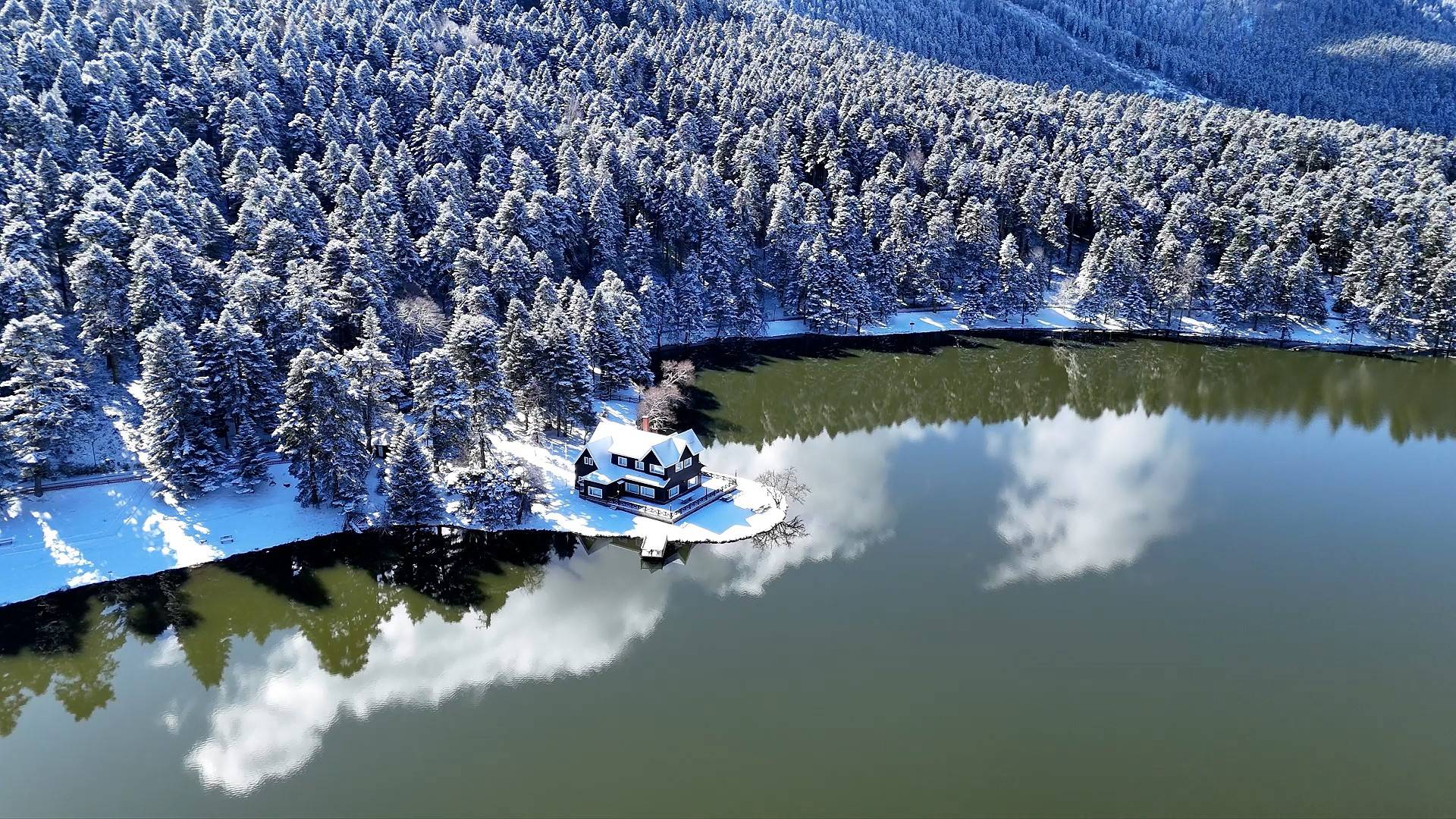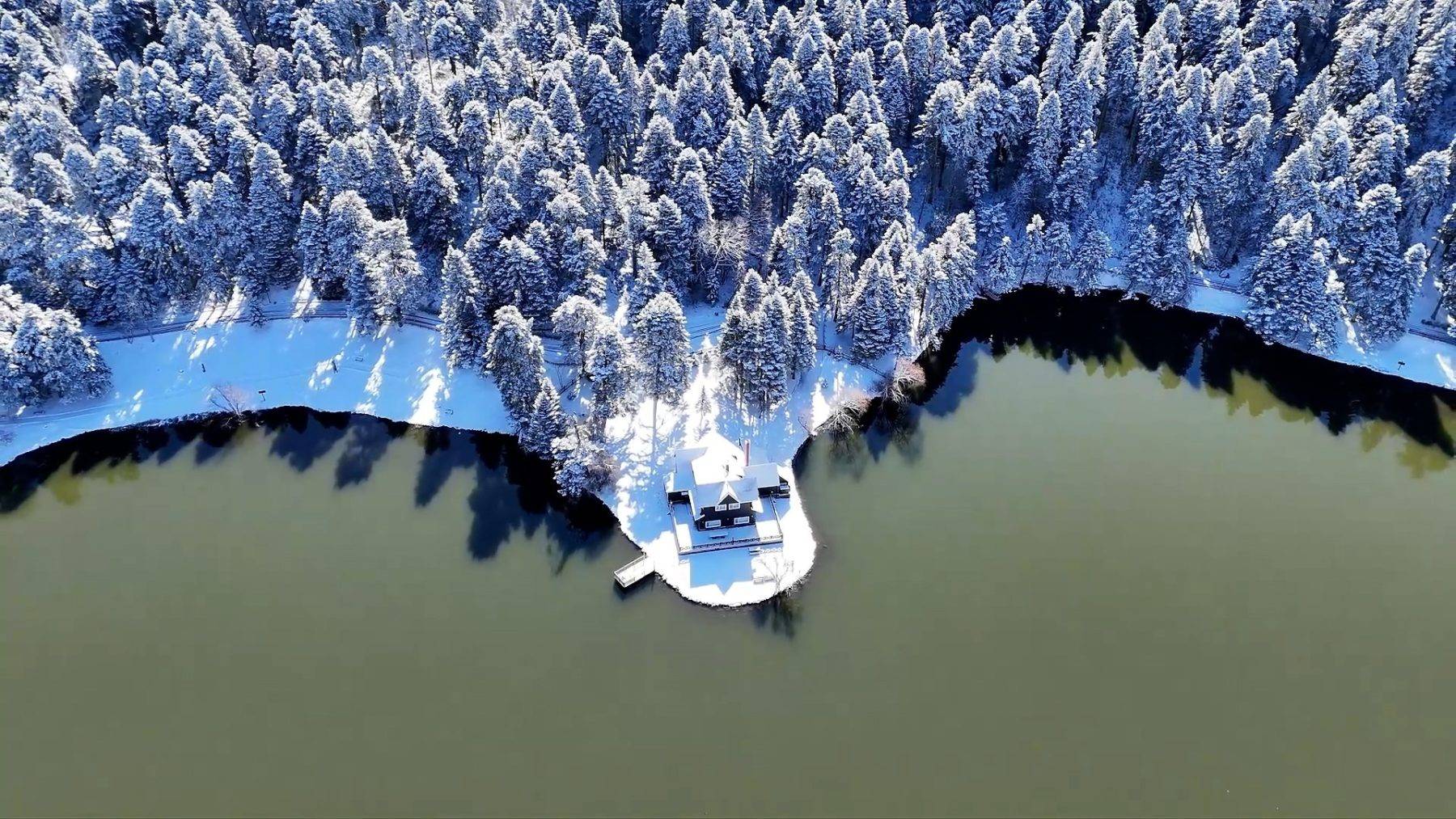Bolu’nun doğa harikası Gölcük Tabiat Parkı, kar yağışının ardından beyaz gelinliğini giydi. Beyaz örtüyle kaplanan ormanlık alanda oluşan kış manzarası, havadan görüntülendi.