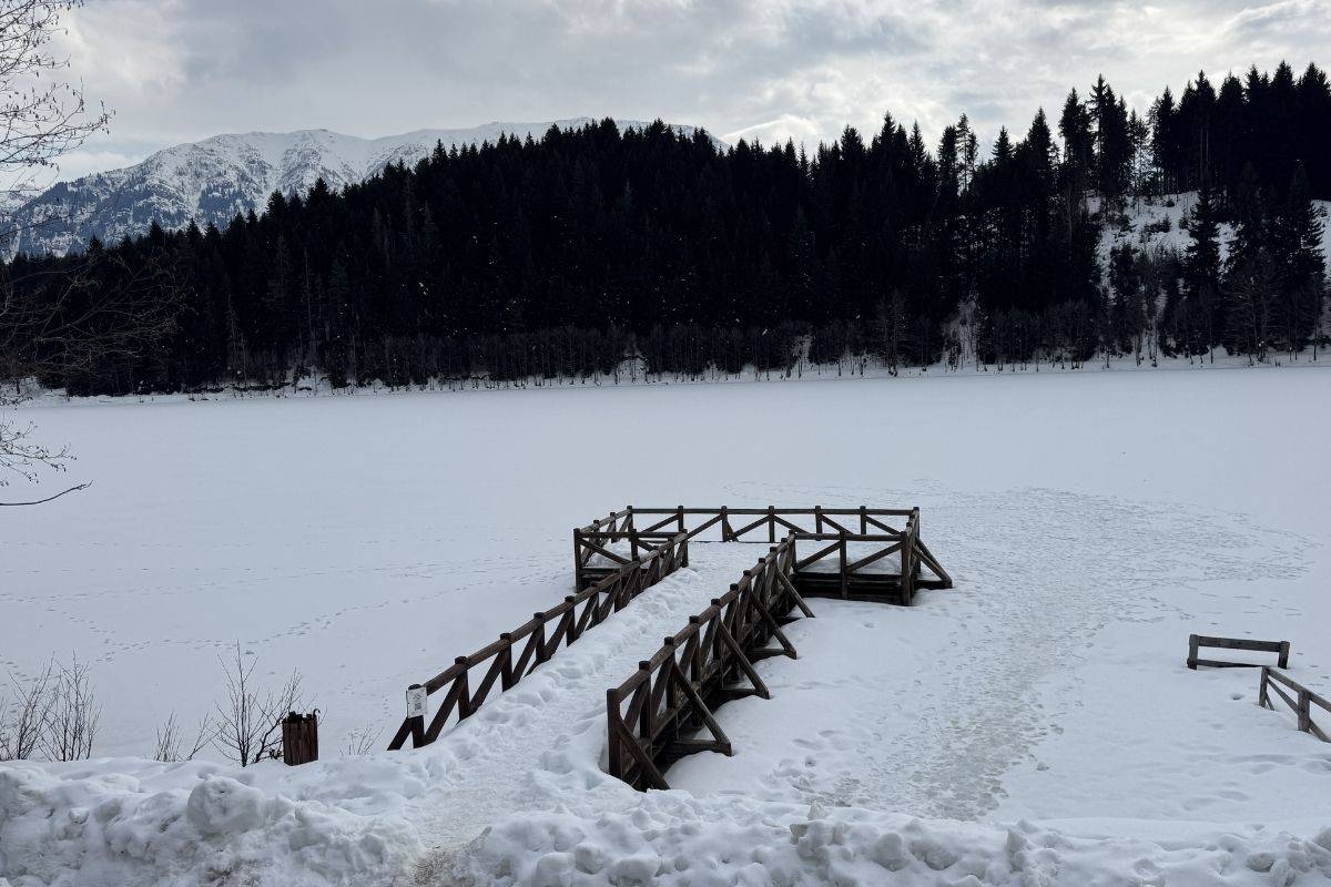 Hava sıcaklıklarının düşmesiyle yüzeyi tamamen donan gölü görebilmek için bölgeye gelen bazı ziyaretçiler, buz üzerinde yürüyüş yapıp horon oynadı.