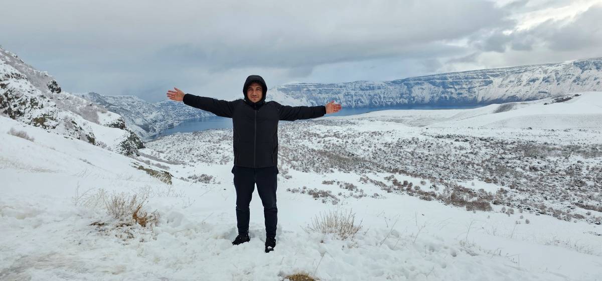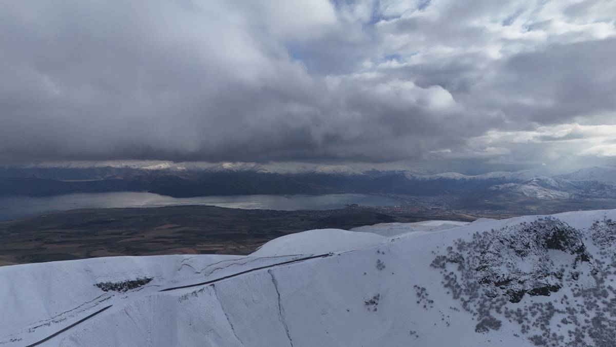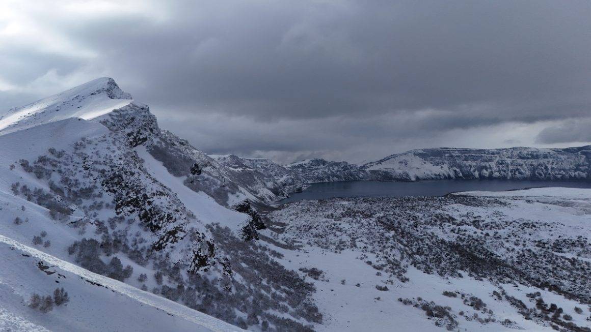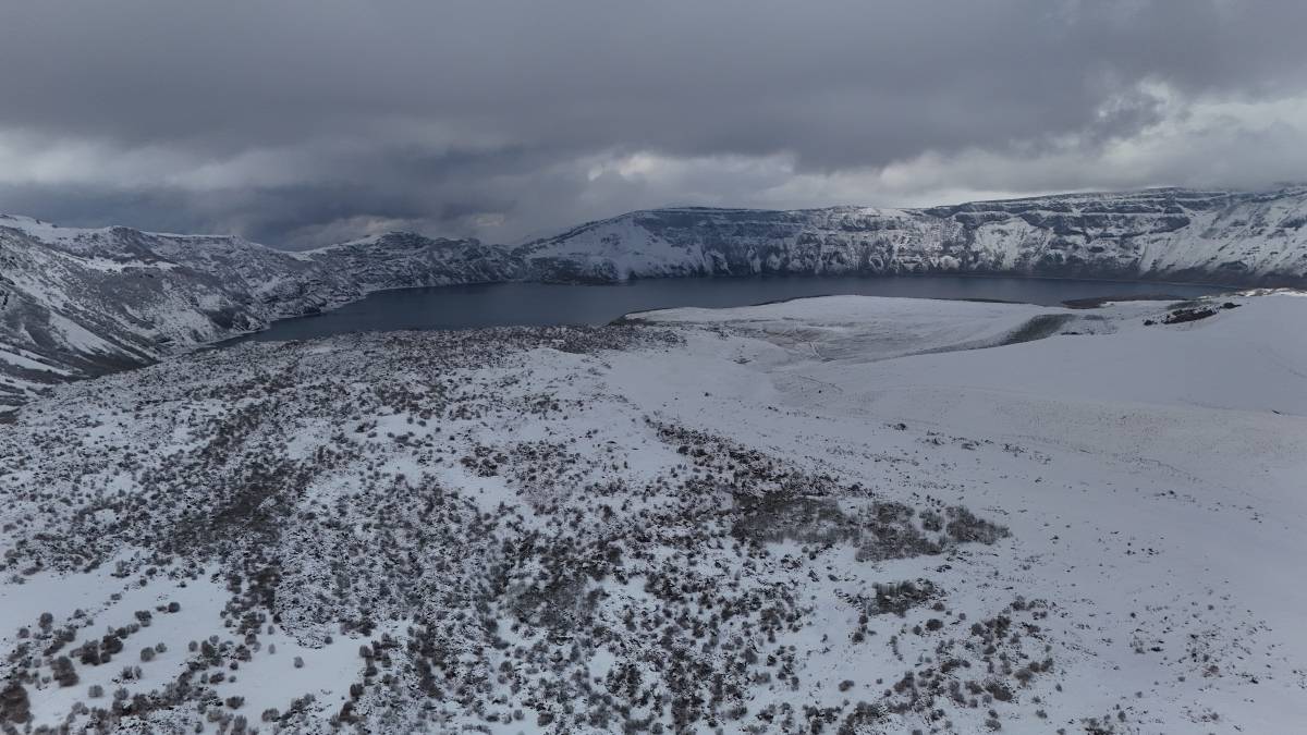 2 bin 250 rakımlı zirvesinde dünyanın ikinci büyük krater gölü yer alan kaldera yağan karla birlikte tamamen beyaza büründü. Dronla görüntülenen kaldera adeta kartpostallık manzaralar sundu.