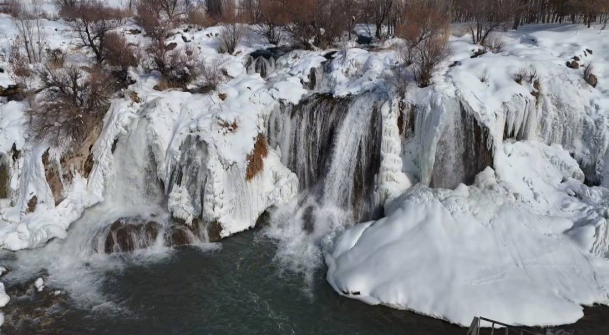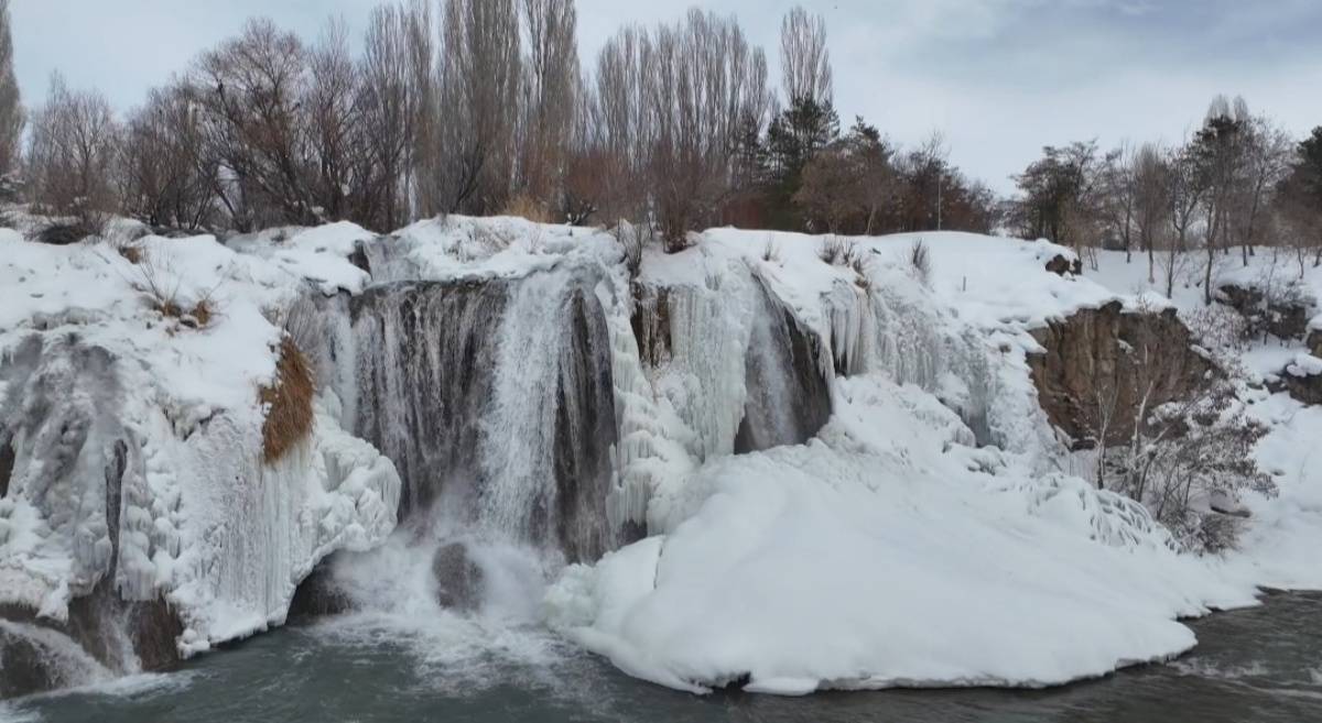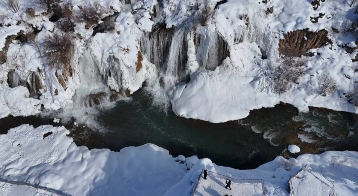 Hava sıcaklığının sıfırın altına düşmesiyle birlikte şelale buz tutarken, çevresini saran kar örtüsüyle ortaya çıkan manzara ‘beyaz gelinlik’ yakıştırmasını bir kez daha haklı çıkardı.