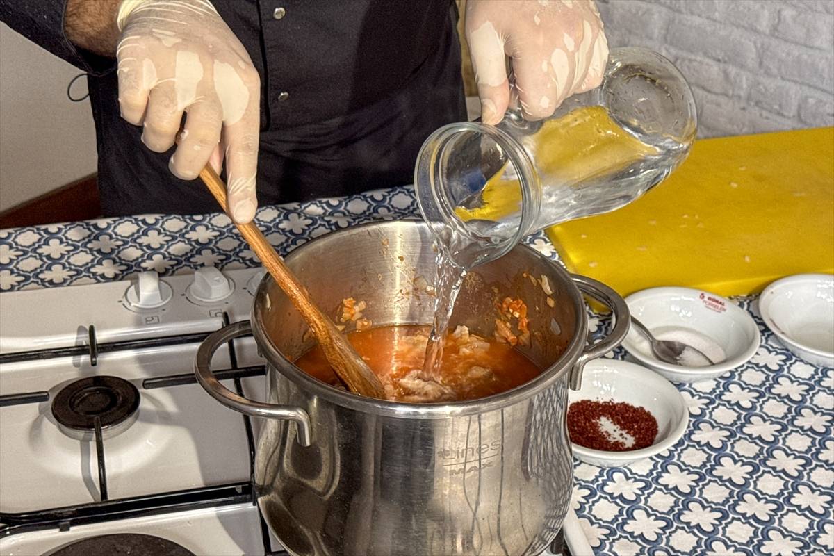 4. Çorti, aşurelik buğday, pul biber, tuz, salça, çorti suyu ve içme suyu tencereye eklenir.