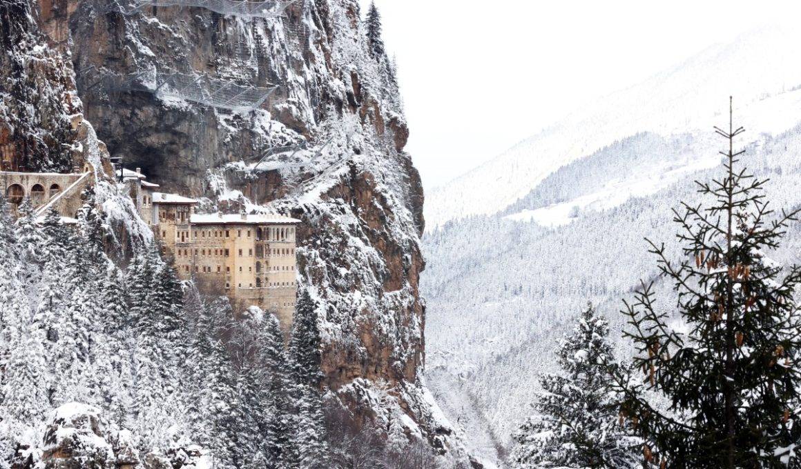 Doğa ve tarih bir arada! Beyaza bürünen Sümela Manastırı mest ediyor