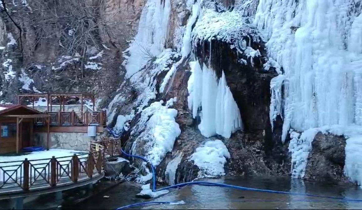 Donan şelaledeki sarkıtlar görenleri hayran bırakıyor