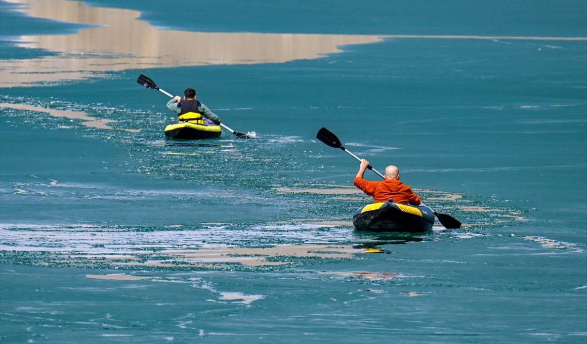 Çözülmeye başlayan gölde buzların arasında kano yaptılar