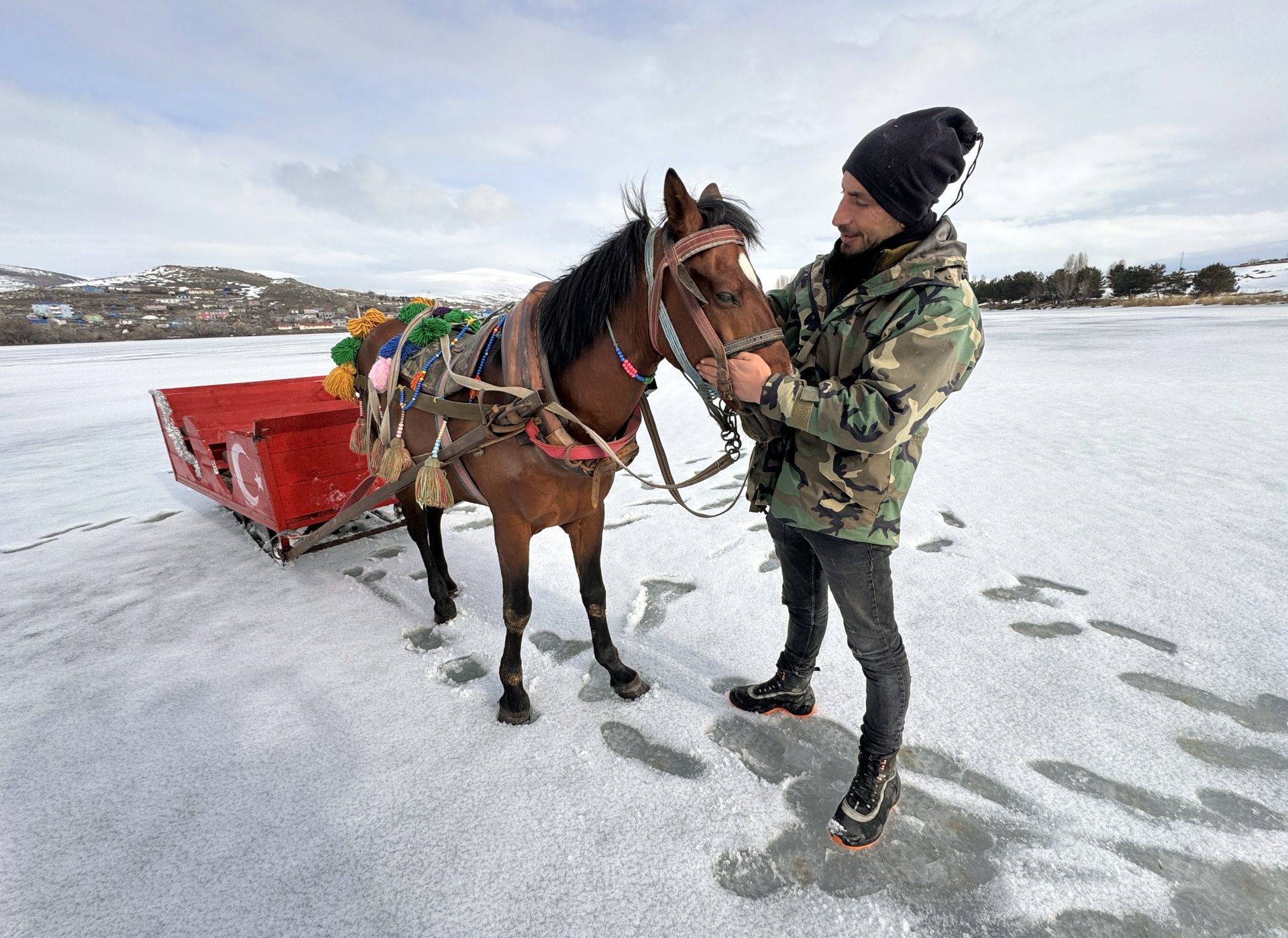 Kış turizminin favori noktalarından biri olan Ardahan’daki Çıldır Gölü’nde atlı kızak sezonu tamamlandı. Göl üzerindeki buz tabakasının yumuşaması ile sonlandırılan sezon sonunda, atlı kızakçılık yapan Kurtuluş Kılıç, atı Destan ile helalleşti.