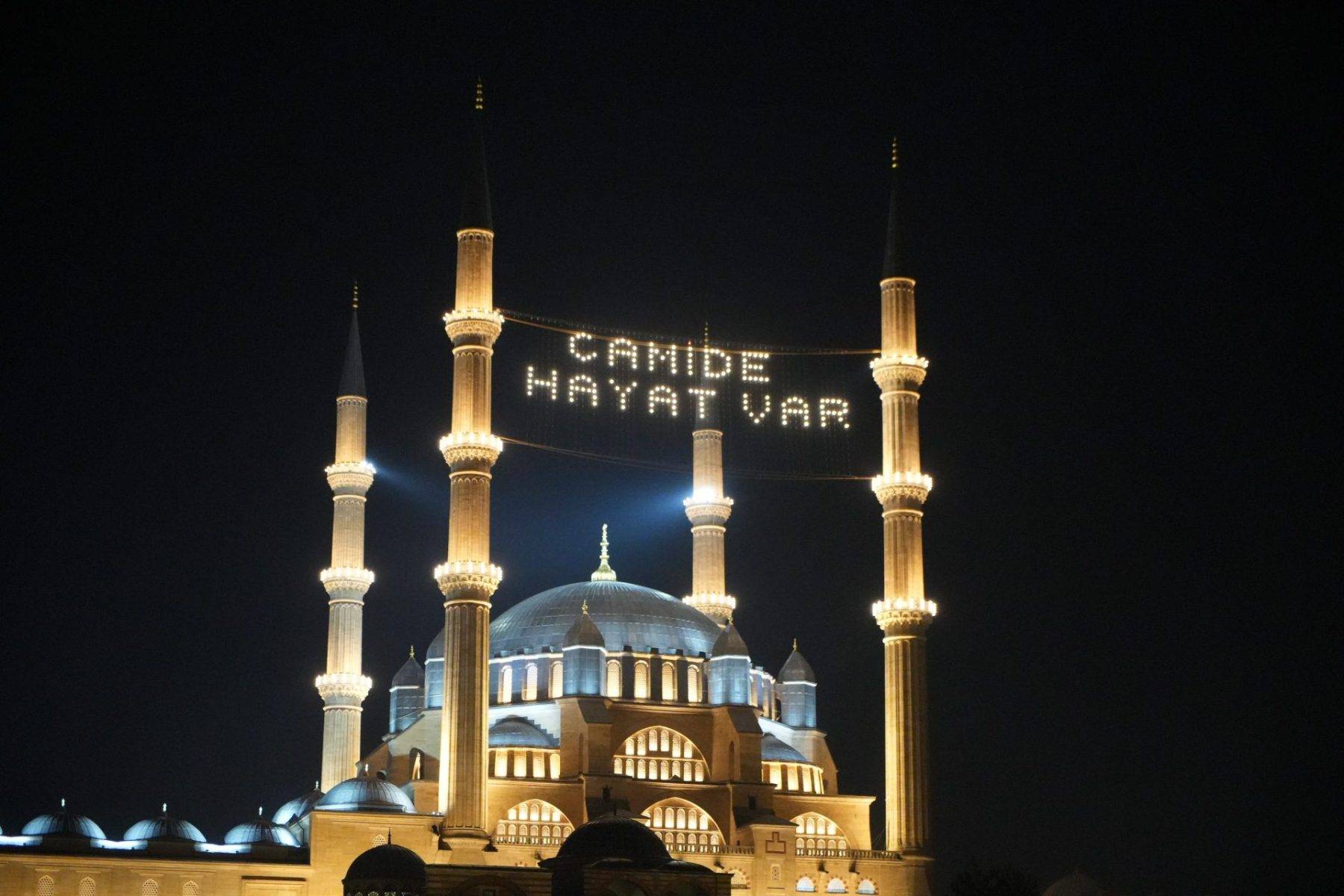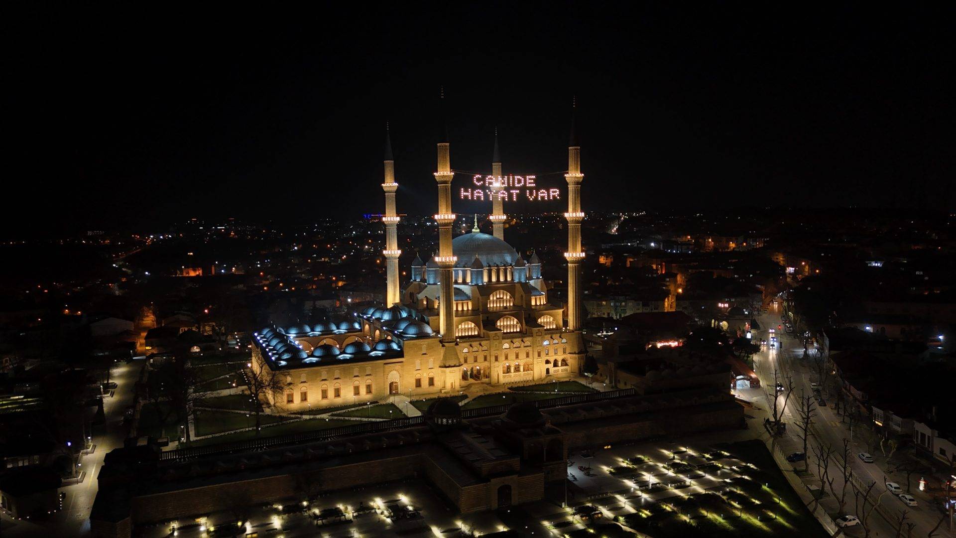 Edirne’de Ramazan ayının manevi atmosferi Selimiye Camii’ne asılan yeni mahya yazısıyla bir kez daha hissedildi. Daha önce minareler arasında “Merhaba ya şehri Ramazan” yazısı yer alırken, bu kez “Camide Hayat Var” mesajı asıldı.