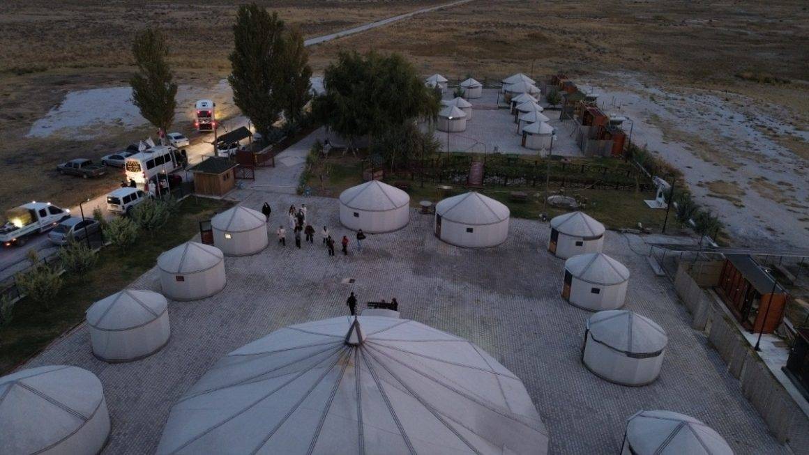 Ziyaretçiler, gün doğumu ve gün batımında Tuz Gölü’nün eşsiz manzarasının tadını çıkarırken, aynı zamanda tuzdan yapılan odalarda nefes terapisi ve dinlenme imkanı buluyor.