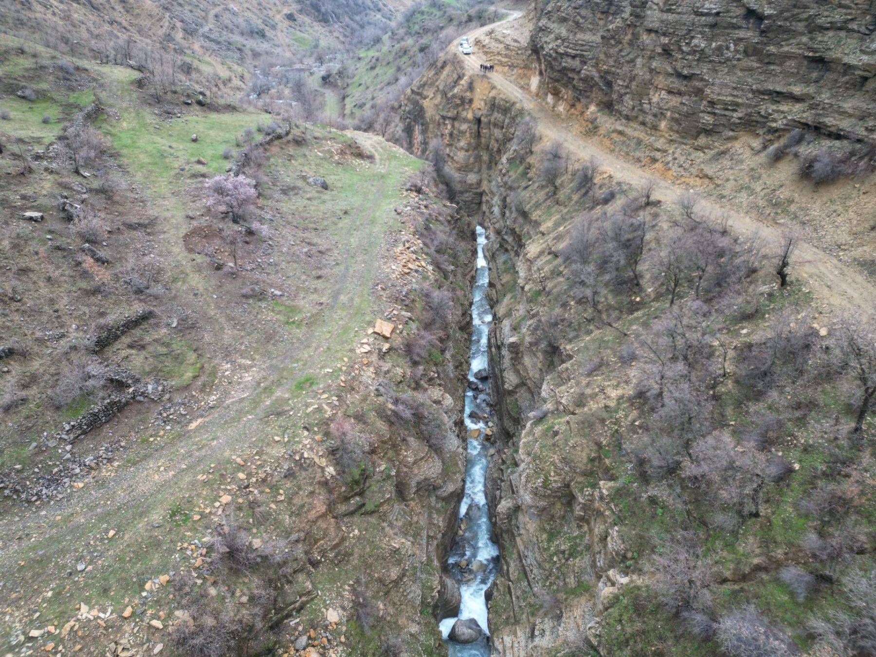 Uludere ilçesindeki Hilal beldesinin eski yerleşim yeri sınırlarında konumlanan kanyon, dronla havadan görüntülendi.