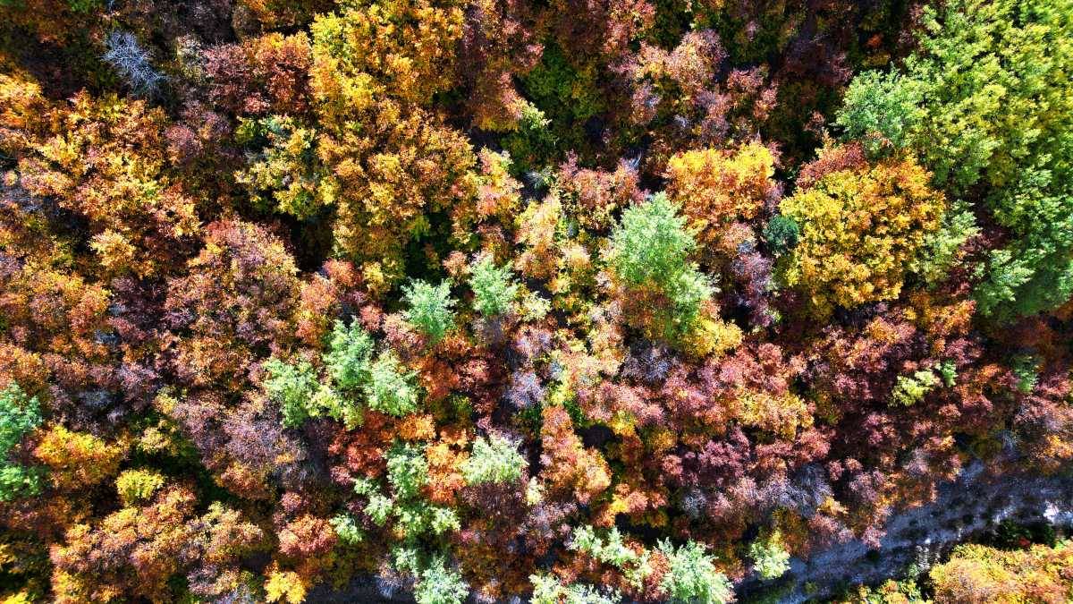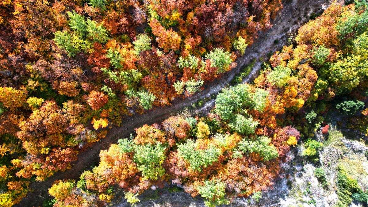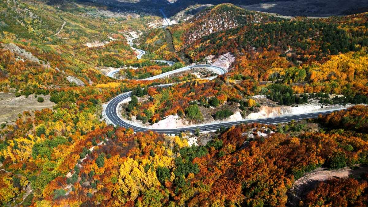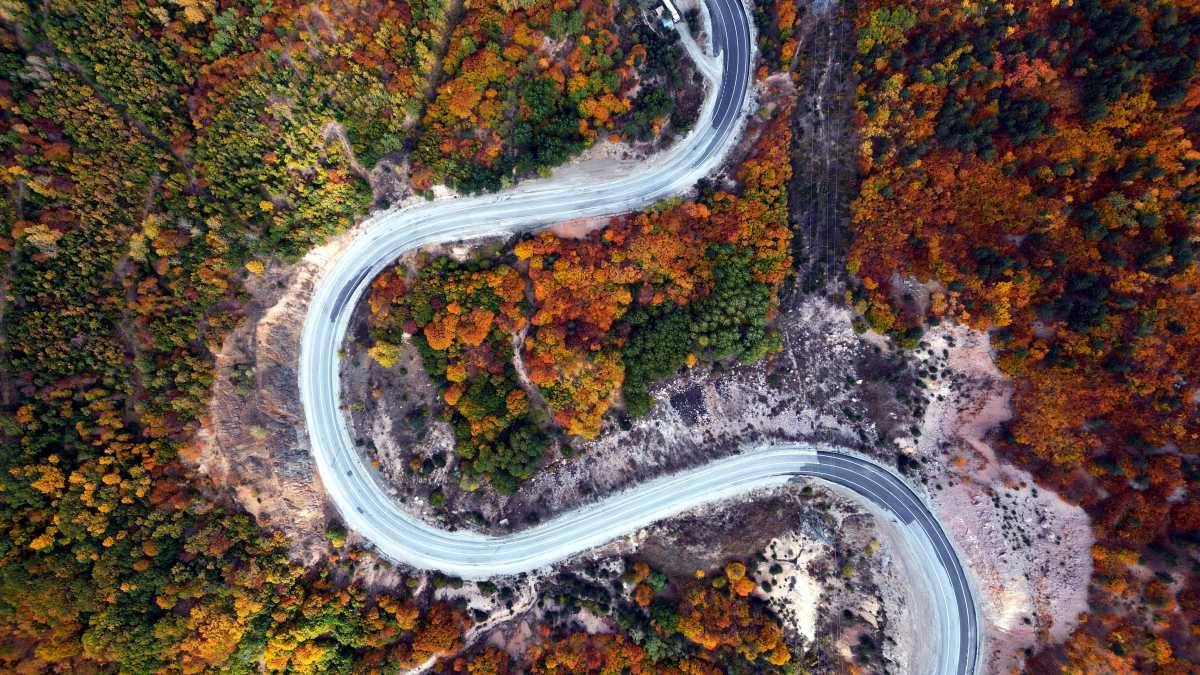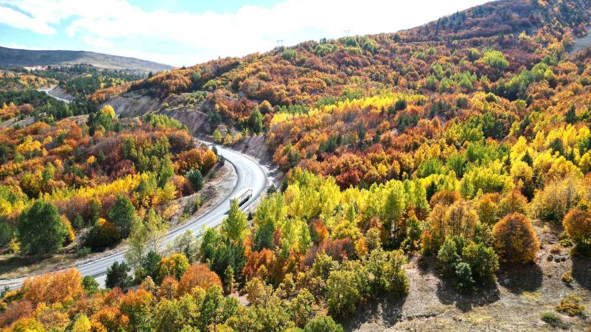 Sarp bir bölgeden geçen yolun her iki tarafında bulunan ağaçlar bugünlerde yeşil, sarı ve kahverengi tonlarından oluşan manzaraya büründü.
