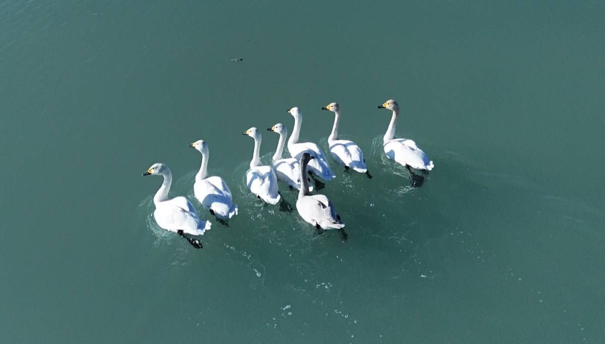 Bu dönemde göle gelen ötücü kuğular, sakin ve etkileyici duruşlarıyla izleyenleri adeta büyülerken, dronla çekilen görüntüler doğanın sunduğu eşsiz güzelliği gözler önüne serdi.