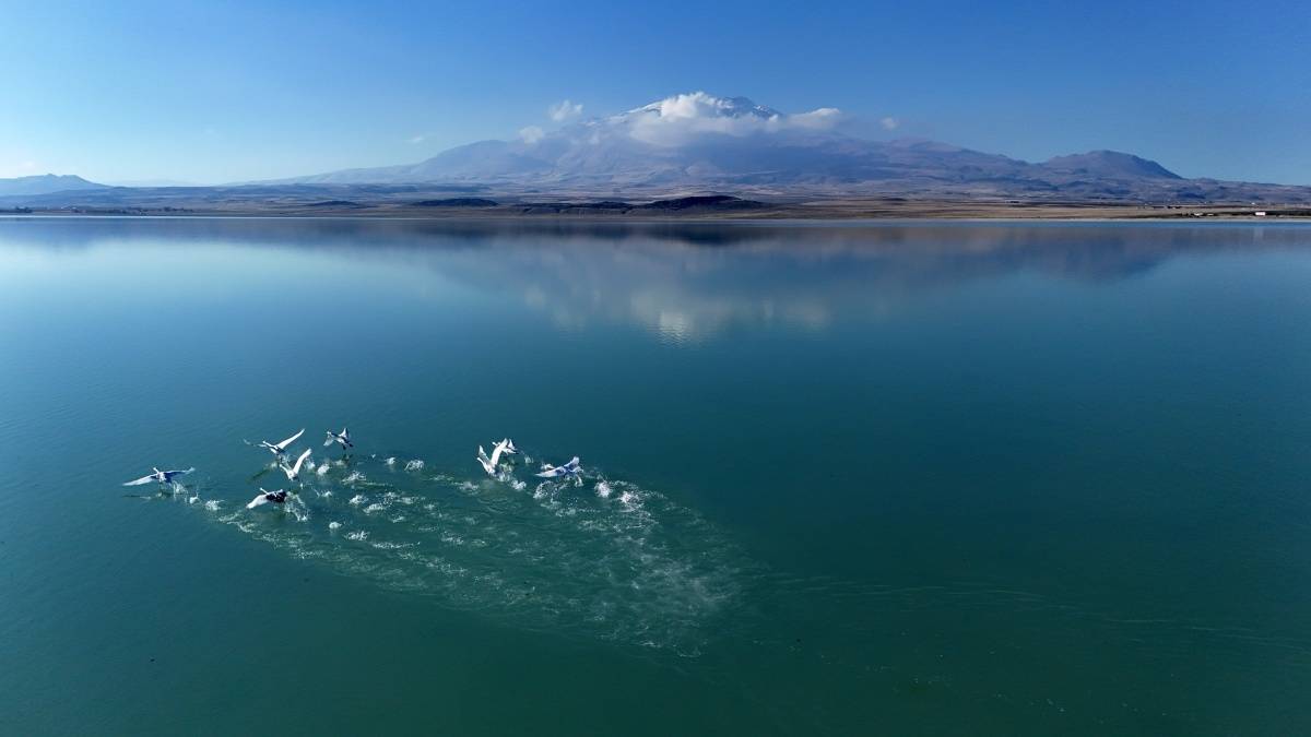 Bitlis’in Adilcevaz ilçesinde bulunan Arin Gölü, göç döneminin en zarif misafirleri olan ötücü kuğuları ağırlamaya başladı. Kuğular ile Süphan Dağı’nın görkemi aynı karede buluştu.