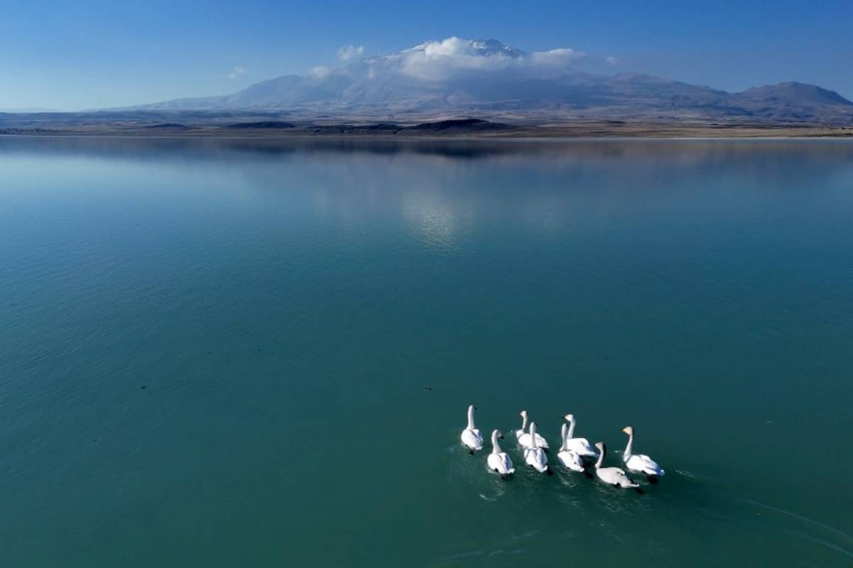 Havadan kaydedilen görüntülerde, Arin Gölü’nün berrak yüzeyinde süzülen kuğuların arka planında yükselen, zirvesi karla kaplı Süphan Dağı dikkat çekti. Kuğular ile dağın görkemi aynı karede buluşunca ortaya kartpostallık manzaralar çıktı.