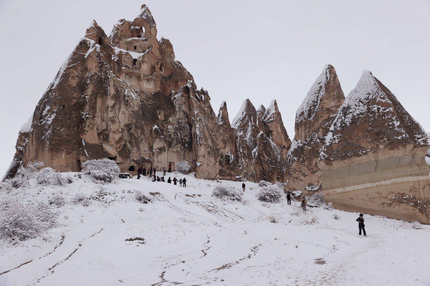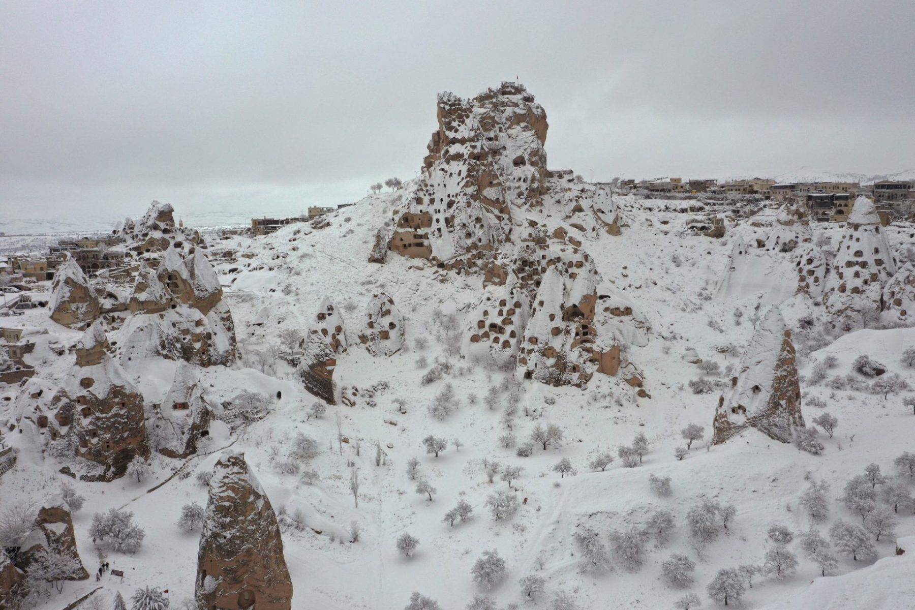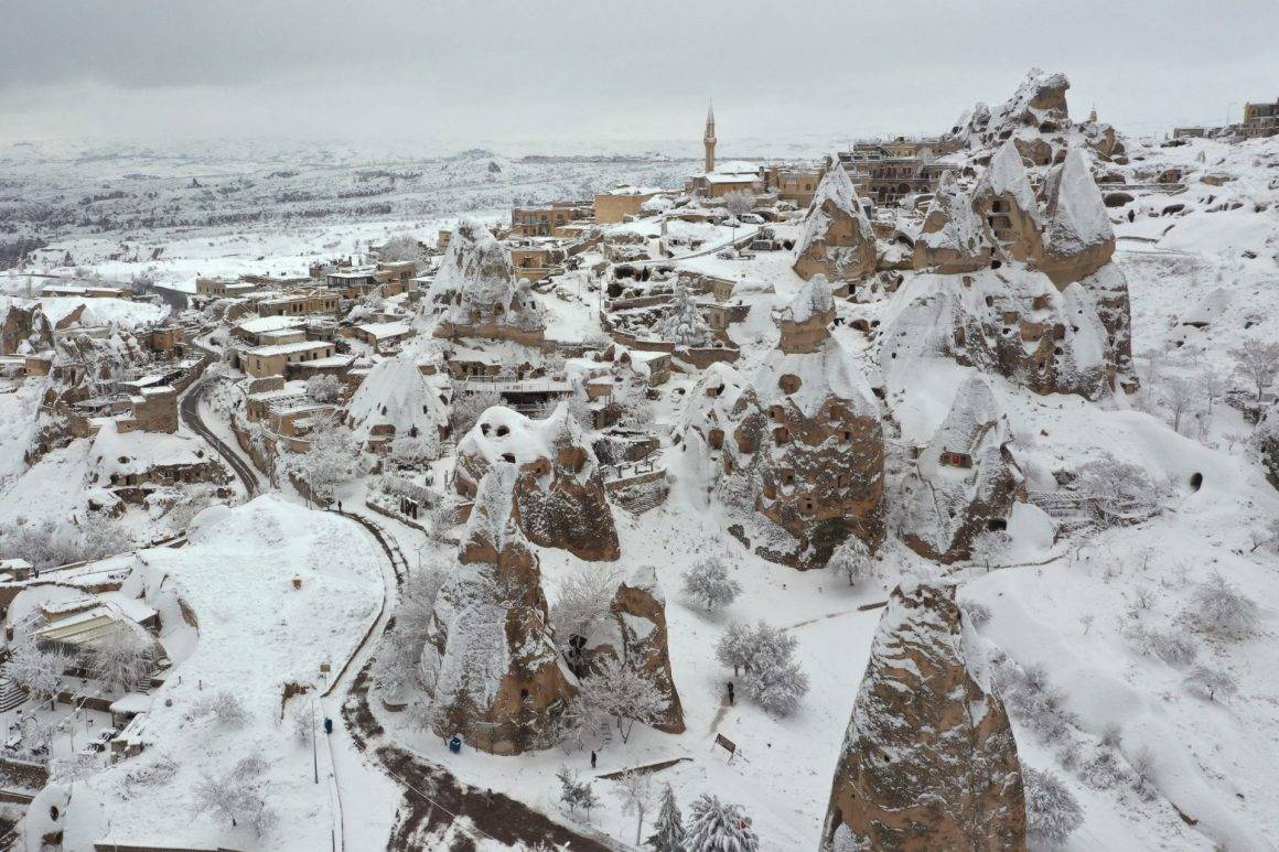 UNESCO Dünya Mirası Listesi’nde yer alan bölgede, turistlerin uğrak noktalarından Göreme, Uçhisar ve Ortahisar beldelerindeki peribacaları ile doğal kaya oluşumları, kar altında farklı bir manzaraya büründü.