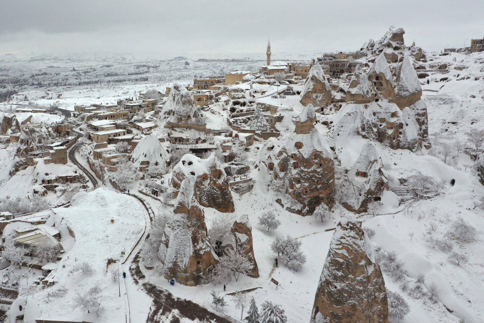 Nevşehir’de yer alan ve turistlerin uğrak noktalarından olan Kapadokya, bölgedeki kar yağışının ardından beyaza büründü. Beyaz örtü altında güzelliklerini katlayan doğal kaya oluşumları havadan görüntülendi.