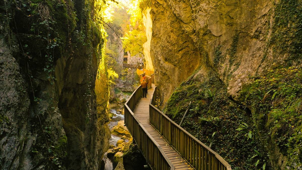 Dev kayalıklar arasından ahşap platformu kullanan ziyaretçiler, güz renklerine bürünen kanyonun tüm güzelliklerini görebiliyor.