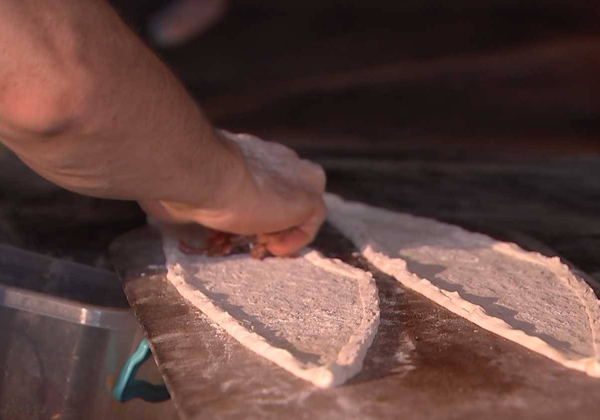 Beze ve açma: Dinlenen hamur, uygun ağırlıkta bezelere ayrılır. Bu bezeler, su kullanılarak ortalama 65-70 cm uzunluğunda ve 10-12 cm genişliğinde, uçlara doğru incelen kayık formunda açılır.